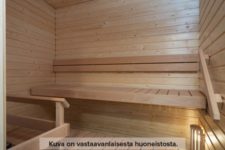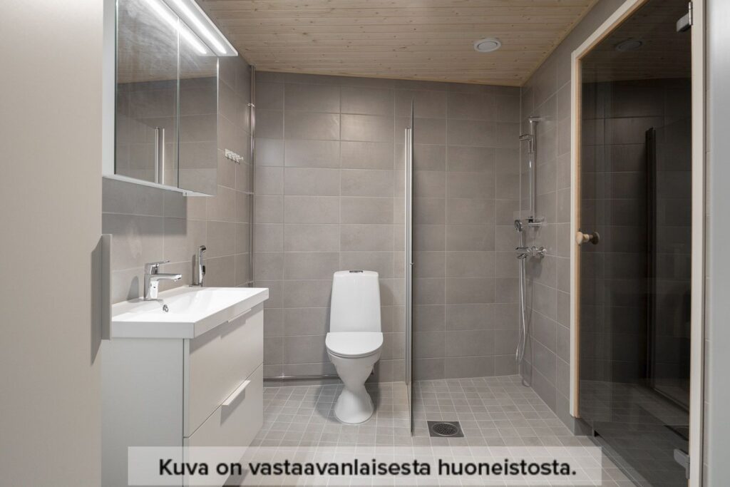 Kylpyhuoneessa on oma sauna sekä tilavaraus pyykinpesukoneelle ja pesutornille. Asuintilojen lattiat ovat laminaattia, ja kylpyhuone sekä erillinen wc on laatoitettu.