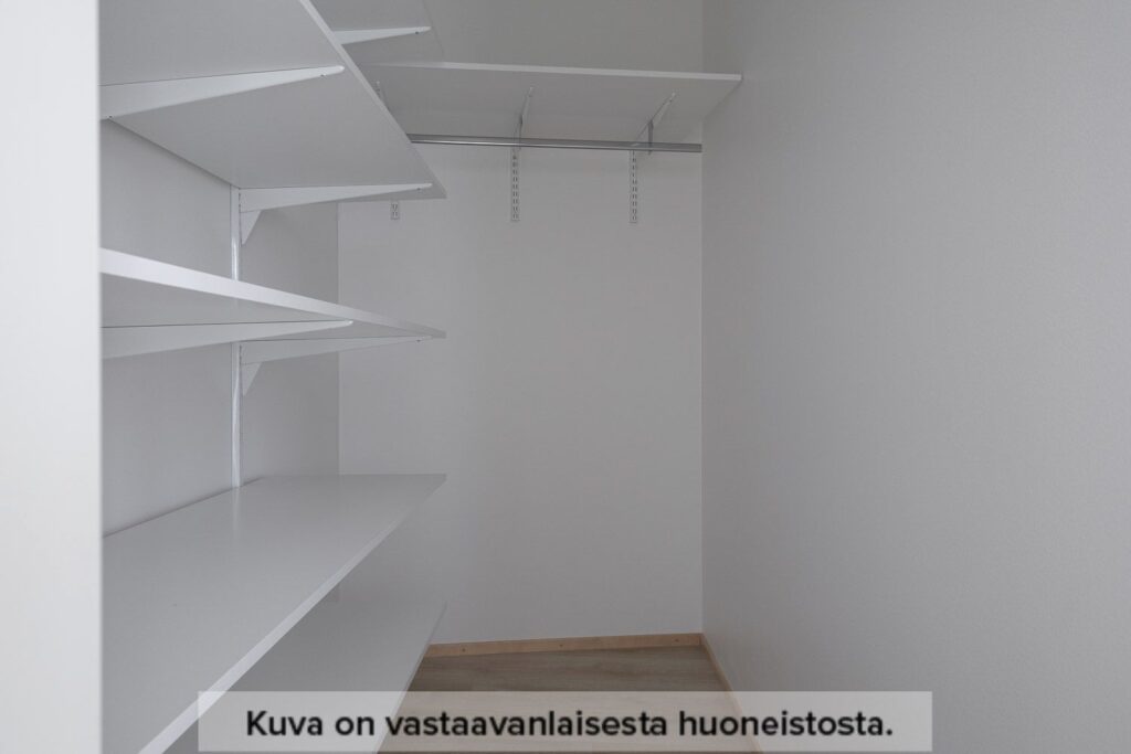 Asunnon keittiö ja olohuone ovat yhtenäistä avaraa tilaa, ja olohuoneesta pääsee asunnon lasitetulle parvekkeelle. Makuuhuoneet ovat asunnon toisessa päädyssä omassa rauhassaan. Toisen makuuhuoneen yhteydessä on vaatehuone, toisessa kaapistot. Kulmamallisessa keittiössä on astianpesukone valmiina.