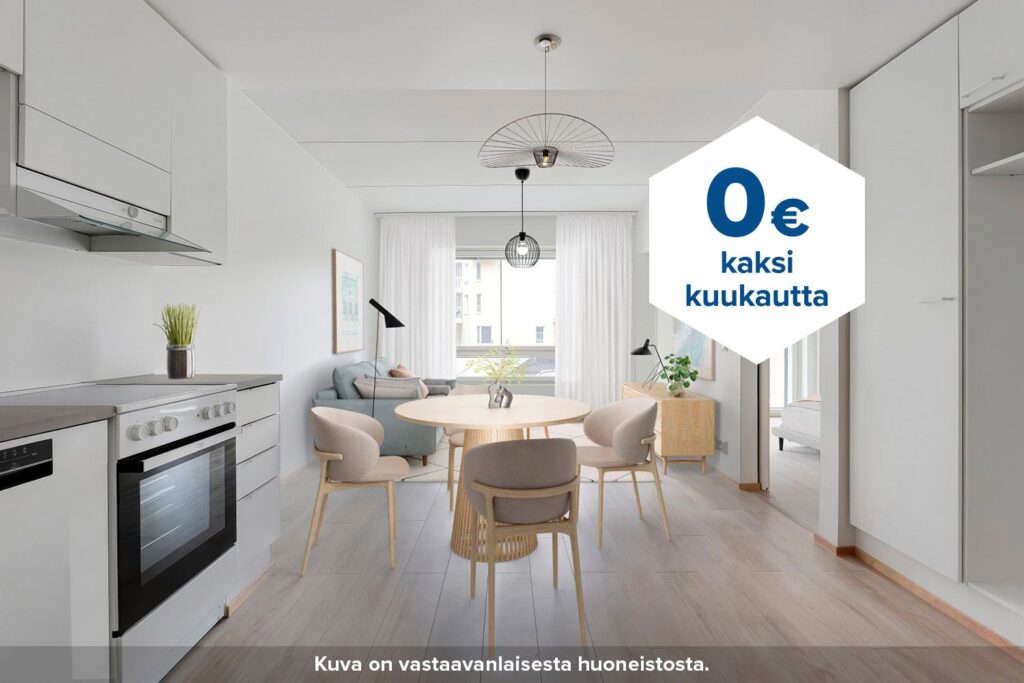 Tee sopimus nyt – saat kahden ensimmäisen kuukauden käyttövastikkeen hintaan 0 € ja vakuusmaksun 250 €. Edut ovat voimassa 15.4.2026 saakka ja koskevat vain uusia asiakkaita. Vesi- ja autopaikkamaksut normaalisti. Edellyttää 12 kuukauden asumista.