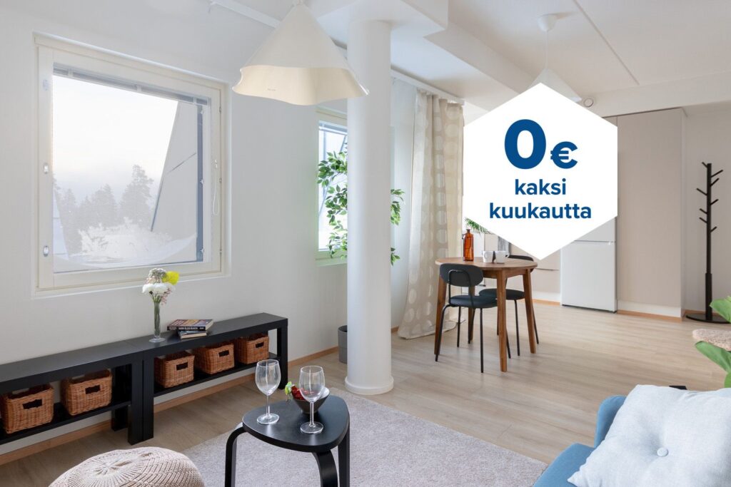 Tee sopimus nyt – saat kahden ensimmäisen kuukauden käyttövastikkeen hintaan 0 € ja vakuusmaksun 250 €. Edut ovat voimassa 15.4.2026 saakka ja koskevat vain uusia asiakkaita. Vesi- ja autopaikkamaksut normaalisti. Edellyttää 12 kuukauden asumista.