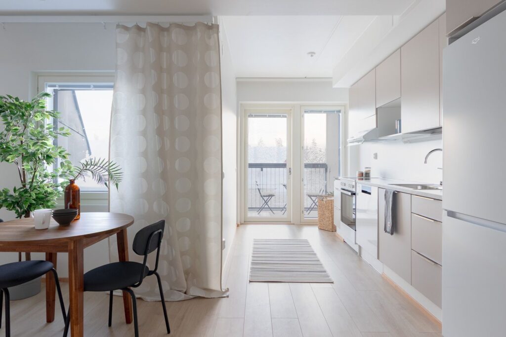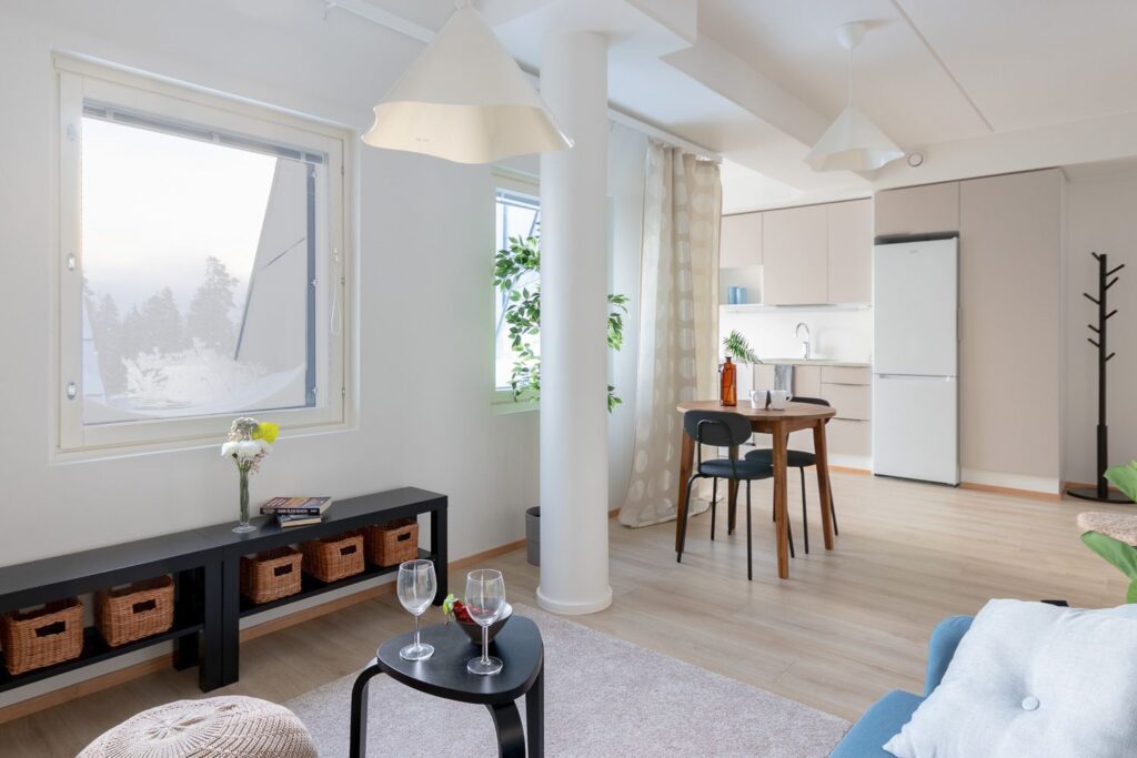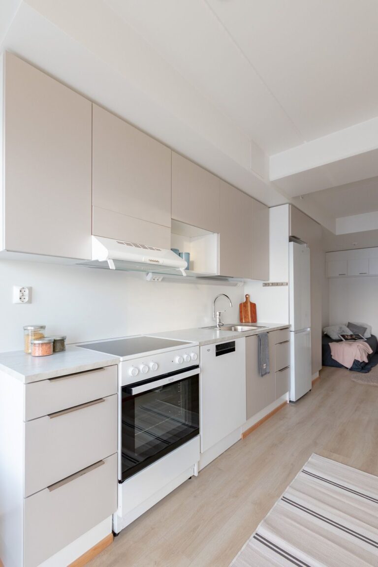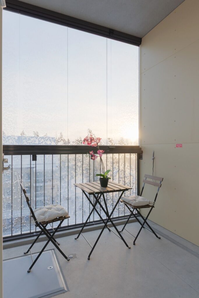 Asunnossa on avara ja toimiva pohjaratkaisu. Keittiö on olohuoneen kanssa yhtenäistä tilaa. Keittiön yhteydestä on kulku lasitetulle parvekkeelle, joka toimii lisähuoneena alkukeväästä myöhäiseen syksyyn. Keittiössä on valmiina astianpesukone ja kylpyhuoneessa on tilavaraus pyykinpesukoneelle ja pesutornille. Oman saunavuoron voi halutessaan varata viihtyisästä talosaunasta.