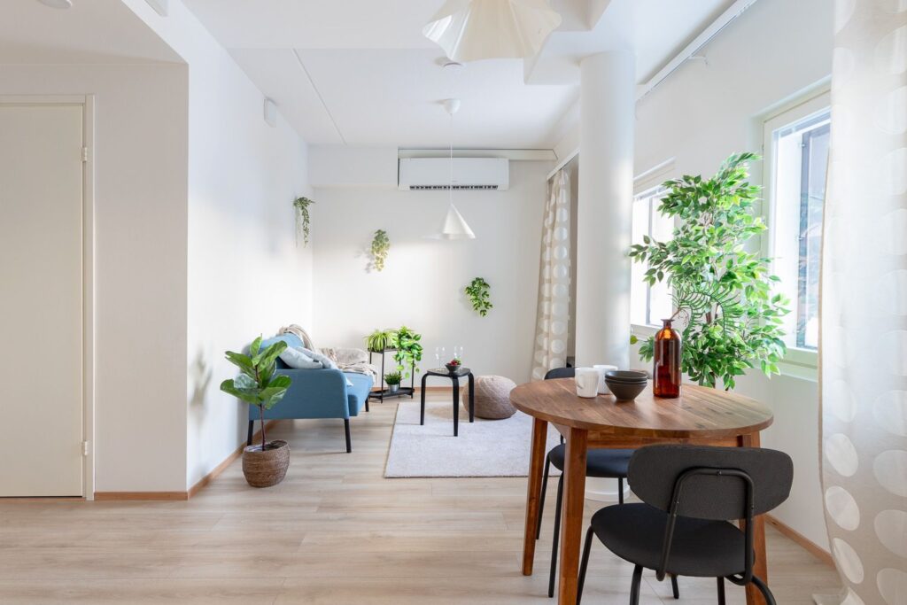 Huom. Tämä ylimmän kerroksen asunto on varustettu huoneistokohtaisella ilmanvaihtolaitteilla ja viilennyksellä, jonka tehokuutta asukas voi itse säätää.