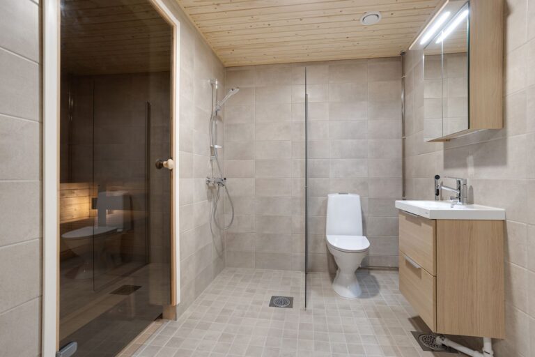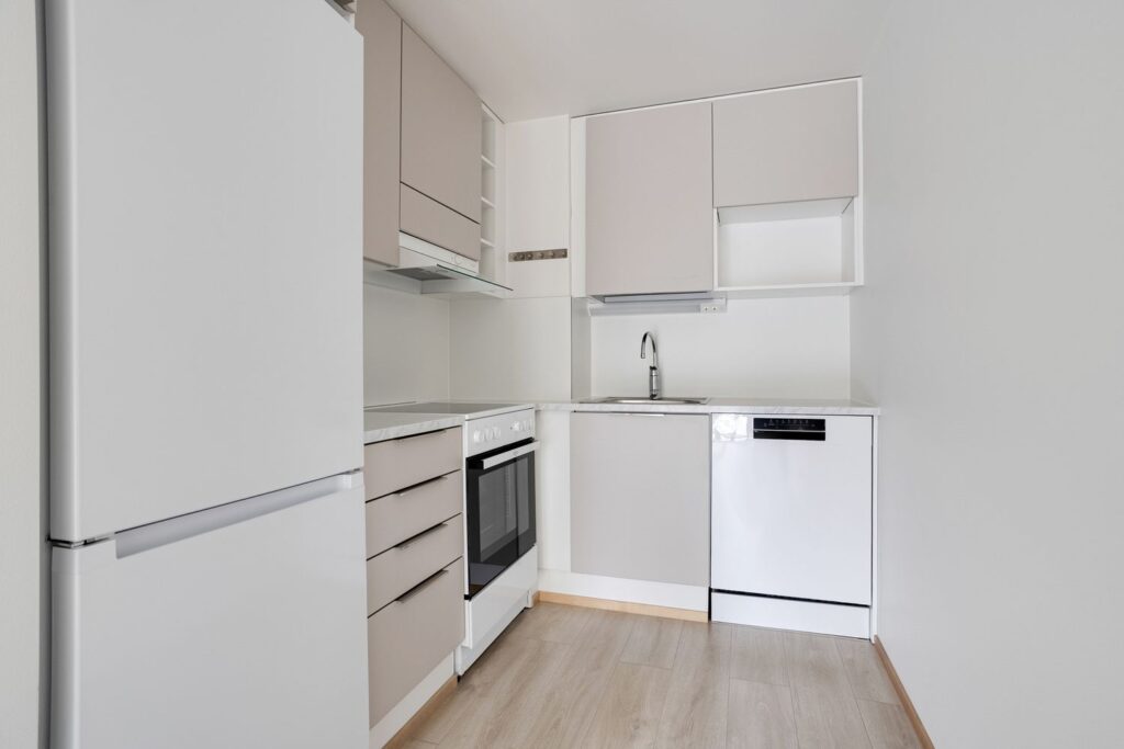 Selkeäpohjainen asunto on helppo sisustaa mieleisekseen. Keittiö on olohuoneen yhteydessä omassa kulmauksessaan, ja siellä on jääkaappipakastin, keraaminen liesi, astianpesukone sekä tilavaraus mikrolle. Kylpyhuoneessa on oma sauna sekä tilavaraus pyykinpesukoneelle ja pesutornille. Asuintilojen lattiat ovat laminaattia, ja kylpyhuone sekä erillinen wc on laatoitettu.