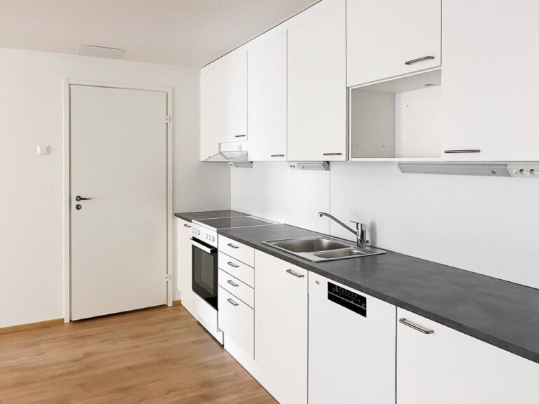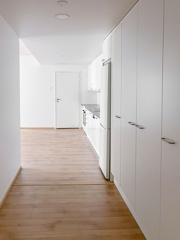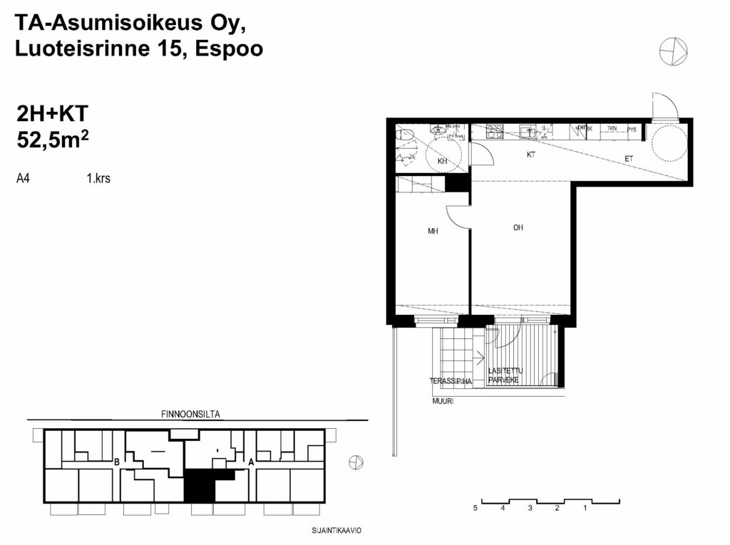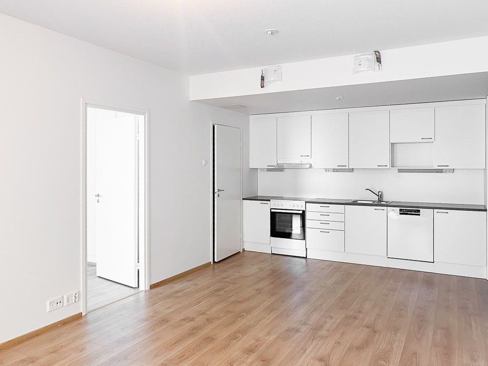 Ensimmäisen kerroksen tilava kaksio, jossa on lasitettu parveke sekä oma pieni terassipiha. Keittiö ja olohuone ovat yhtenäistä, avaraa tilaa. Keittiössä on valmiina astianpesukone, keraaminen liesi ja jääkaappipakastin sekä tilavaraus mikrolle. Asumismukavuutta lisäävät sälekaihtimet ikkunoissa. Kylpyhuoneessa on tilavaraus pyykinpesukoneelle ja kuivausrummulle ja säilytystilaa allas-, pyykki- ja peilikaapeissa. Saunavuoron voi halutessaan varata yhteisestä talosaunasta.