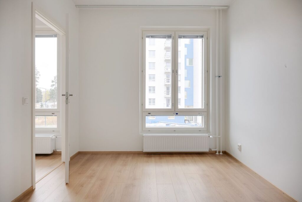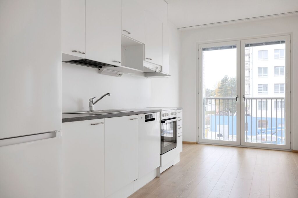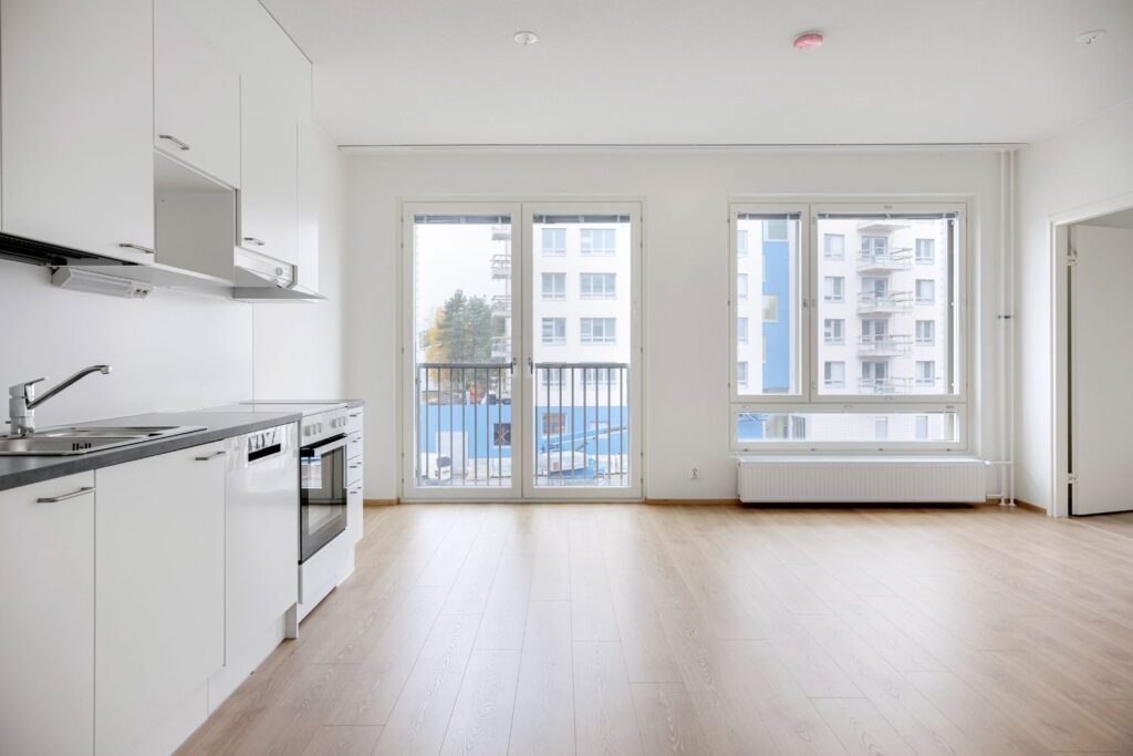 Kolmannen kerroksen uusi kaksio, jossa on ranskalainen parveke ja avara pohjaratkaisu