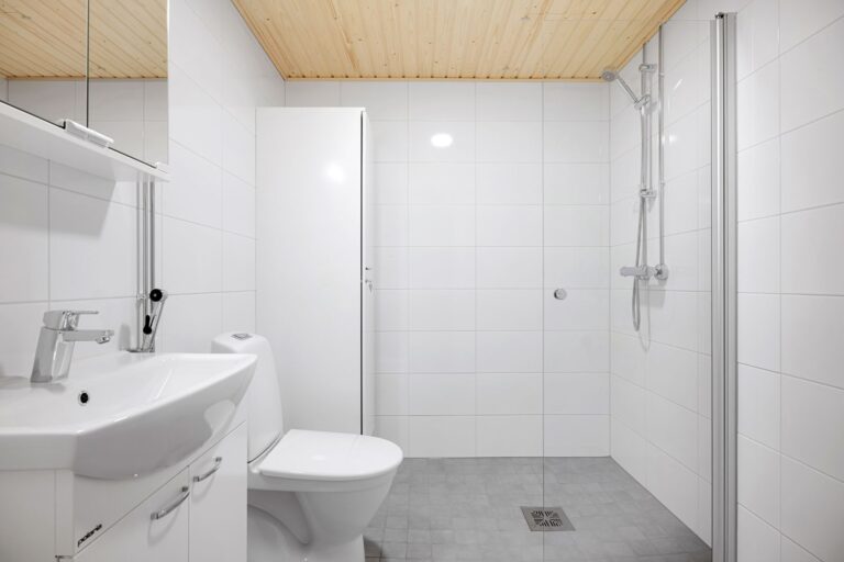 Kylpyhuoneessa on tilavaraus pyykinpesukoneelle ja kuivausrummulle ja säilytystilaa allas-, pyykki- ja peilikaapeissa. Saunavuoron voi halutessaan varata yhteisestä talosaunasta.