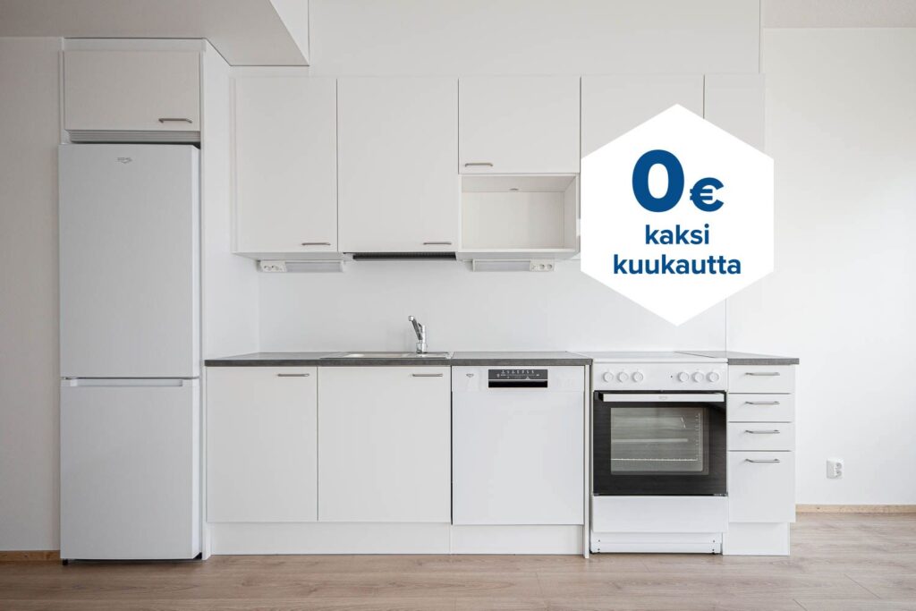 Tee sopimus nyt – saat kahden ensimmäisen kuukauden käyttövastikkeen hintaan 0 € ja vakuusmaksun 250 €. Edut ovat voimassa 15.4.2026 saakka ja koskevat vain uusia asiakkaita. Vesi- ja autopaikkamaksut normaalisti. Edellyttää 12 kuukauden asumista.
