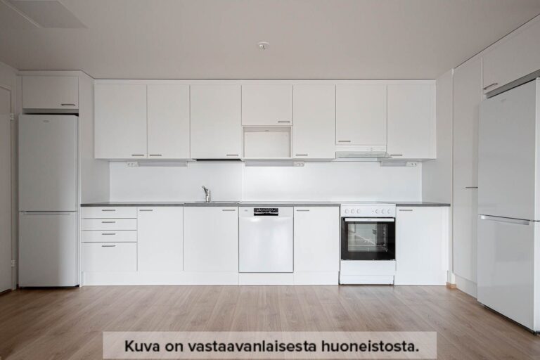 Keittiö ja olohuone ovat yhtenäistä tilaa, josta kuljetaan myös asunnon lasitetulle parvekkeelle. Keittiössä on valmiina astianpesukone, keraaminen liesi, kaksi jääkaappipakastinta sekä tilavaraus mikrolle. Makuuhuoneita on kolme, ja niissä on kaikissa säilytystilaa kaapistoissa.