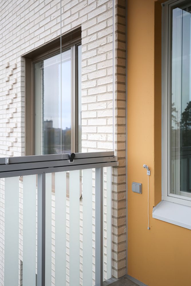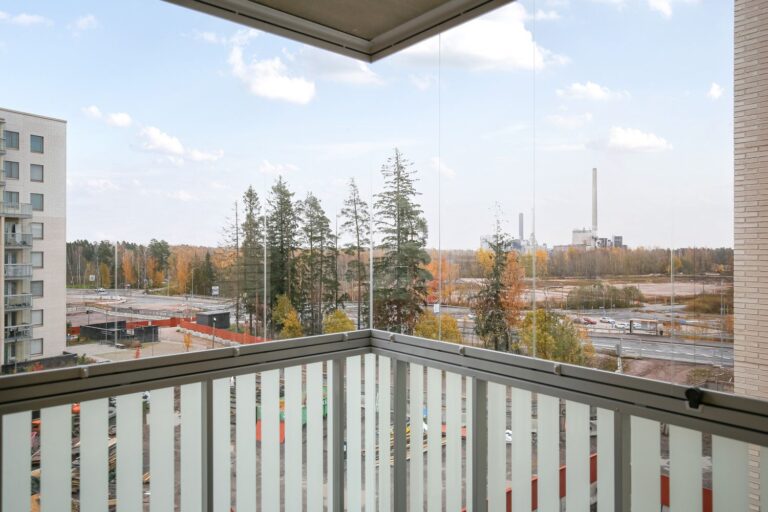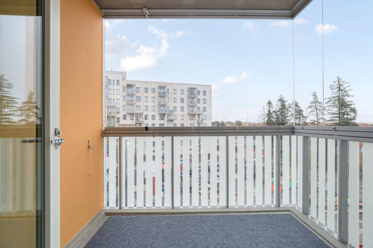 Neljännen kerroksen viihtyisä uusi kolmio, jossa on lasitettu parveke