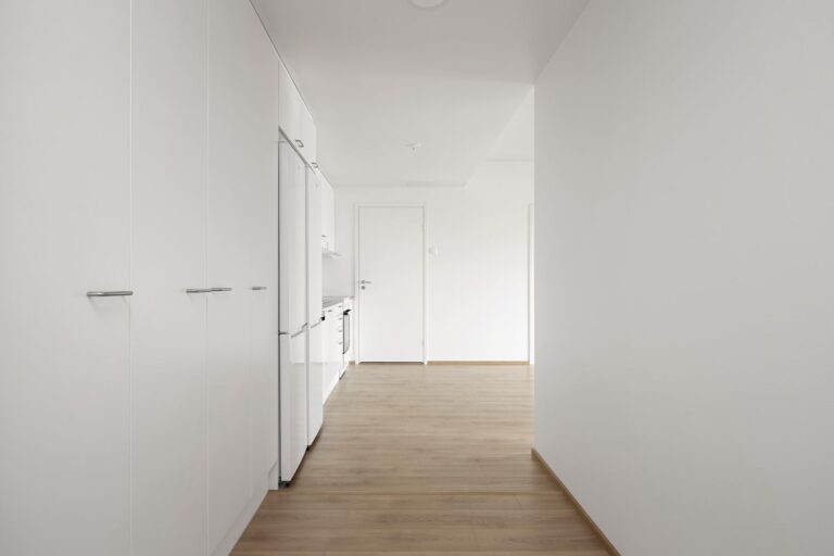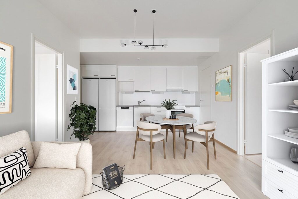 Keittiö ja olohuone ovat yhtenäistä avaraa tilaa. Keittiössä on valmiina astianpesukone, keraaminen liesi, kaksi jääkaappipakastinta sekä tilavaraus mikrolle. Makuuhuoneisiin kuljetaan olohuoneesta, ja niissä on säilytystilaa kaapistoissa. Asumismukavuutta lisäävät sälekaihtimet ikkunoissa.