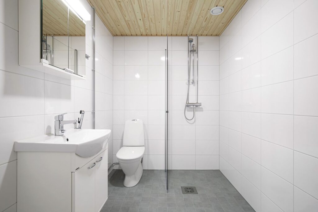 Kylpyhuoneessa on tilavaraus pyykinpesukoneelle ja kuivausrummulle sekä säilytystilaa allas- ja peilikaapeissa. Saunavuoron voi halutessaan varata yhteisestä talosaunasta.