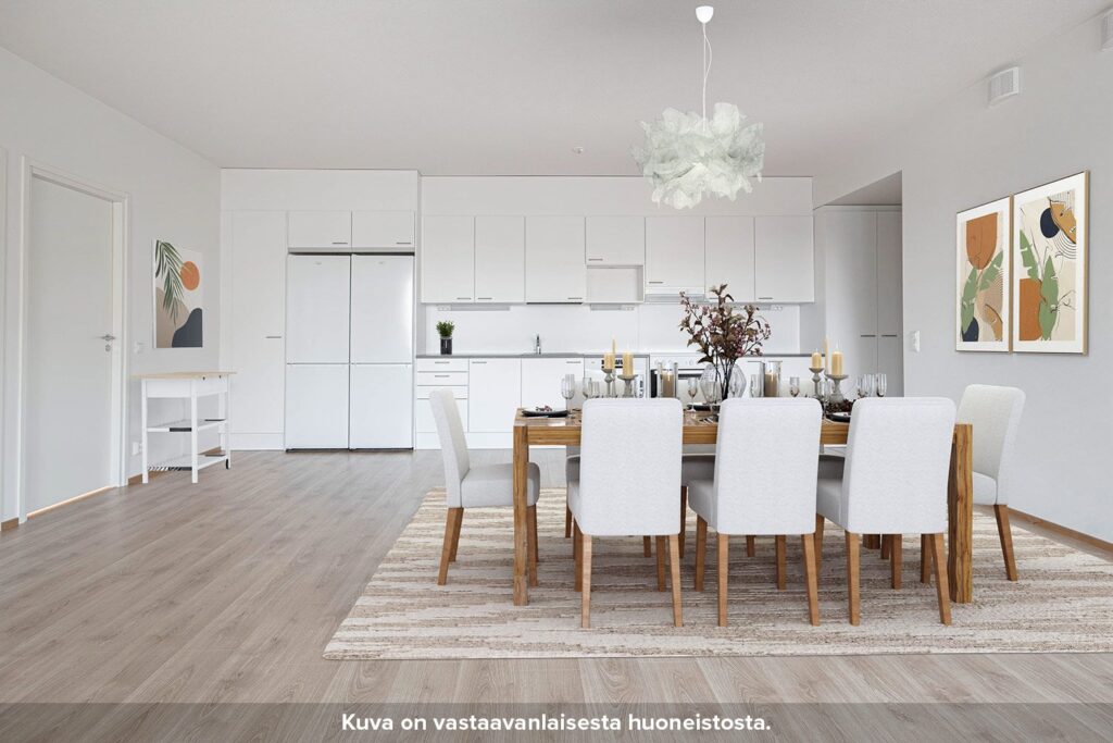 Neljännen kerroksen avarapohjainen neljän huoneen asunto, jossa on tilaa isommallekin perheelle. Tähän kulmahuoneistoon tulee valoa kahdesta ilmansuunnasta. Keittiö ja olohuone ovat yhtenäistä tilaa, jonka yhteydessä on myös asunnon lasitettu parveke. Keittiössä on valmiina astianpesukone, keraaminen liesi, kaksi jääkaappipakastinta sekä tilavaraus mikrolle. Makuuhuoneet sijaitsevat asunnon kulmissa, ja niissä on säilytystilaa kaapistoissa. Asumismukavuutta lisäävät erillis-wc kylpyhuoneen lisäksi sekä sälekaihtimet ikkunoissa. Kylpyhuoneessa on tilavaraus pyykinpesukoneelle ja kuivausrummulle sekä säilytystilaa allas- ja peilikaapeissa. Saunavuoron voi halutessaan varata yhteisestä talosaunasta.