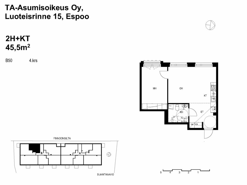 Neljännen kerroksen kaksio, jossa on ranskalainen parveke. Asunnossa on avara pohjaratkaisu – keittiö ja olohuone ovat yhtenäistä tilaa. Keittiössä on valmiina astianpesukone, keraaminen liesi ja jääkaappipakastin sekä tilavaraus mikrolle.
