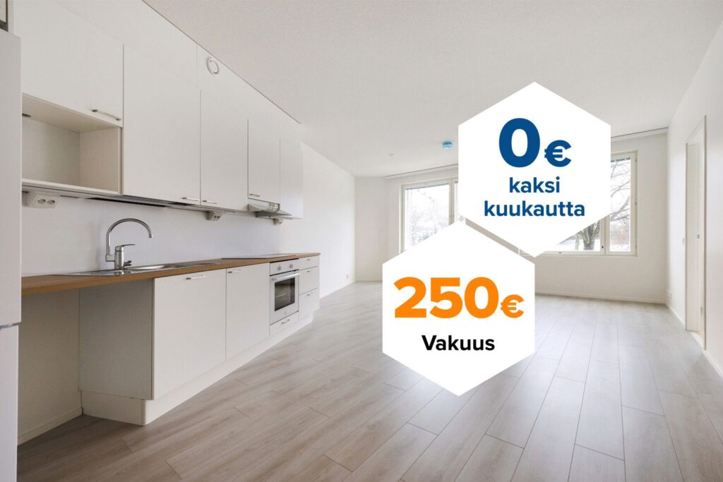 Tee sopimus nyt – saat kahden ensimmäisen kuukauden käyttövastikkeet hintaan 0 € ja vakuusmaksun 250 €. Etu voimassa 15.4.2026 saakka ja koskee vain uusia asiakkaita. Vesi- ja autopaikkamaksut normaalisti. Edellyttää 12 kk asumista.