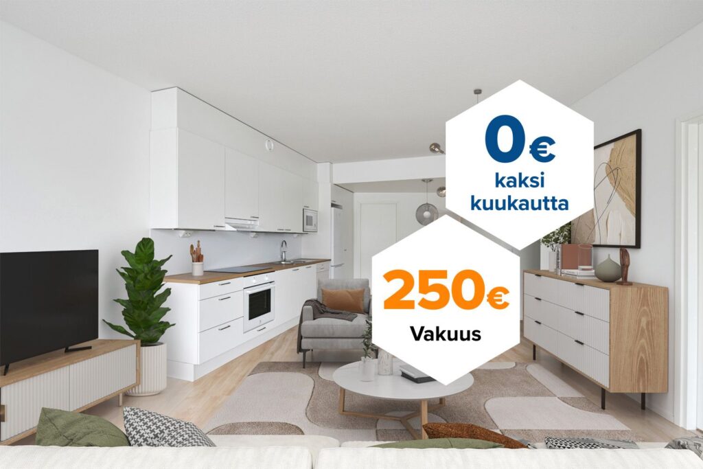 Tee sopimus nyt – saat kahden ensimmäisen kuukauden käyttövastikkeet hintaan 0 € ja vakuusmaksun 250 €. Etu voimassa 15.4.2026 saakka ja koskee vain uusia asiakkaita. Vesi- ja autopaikkamaksut normaalisti. Edellyttää 12 kk asumista.