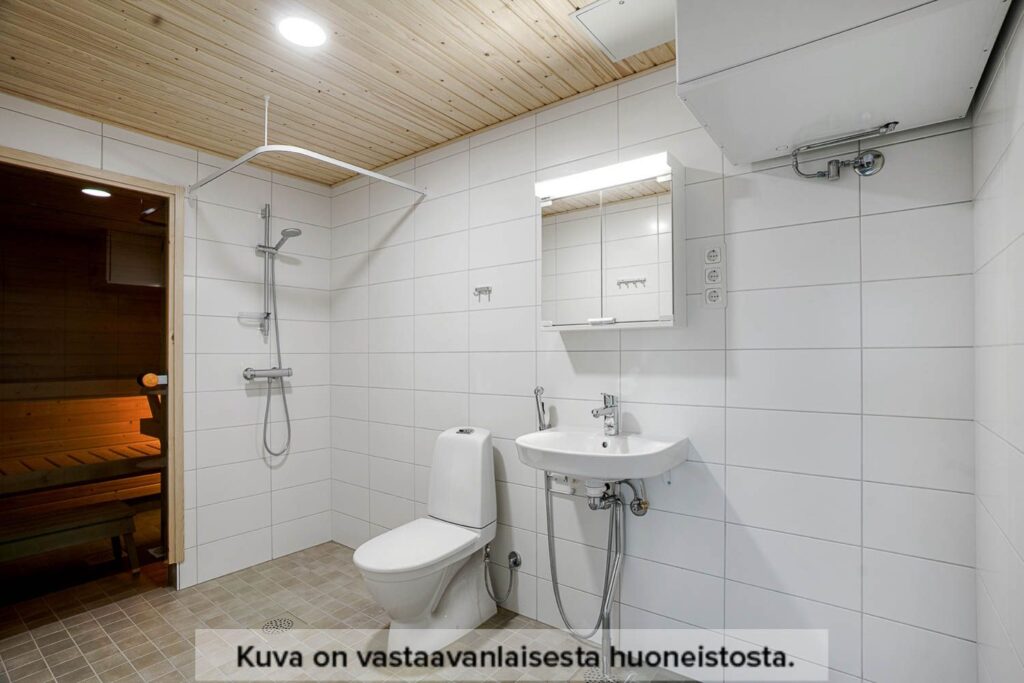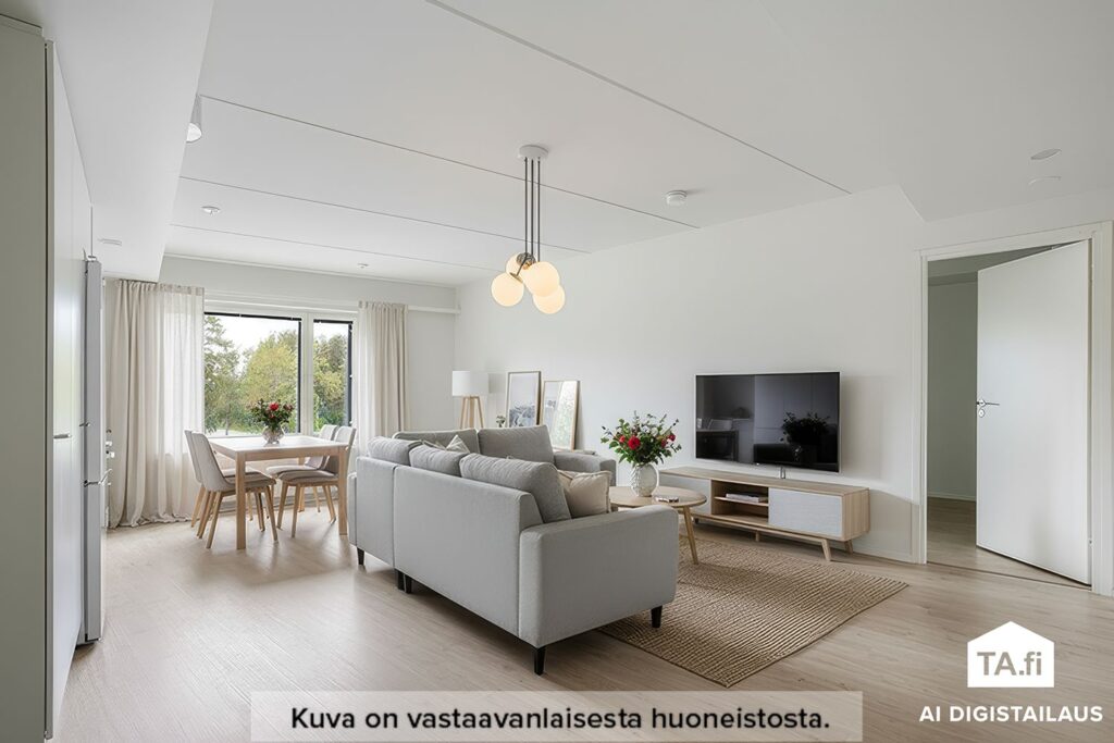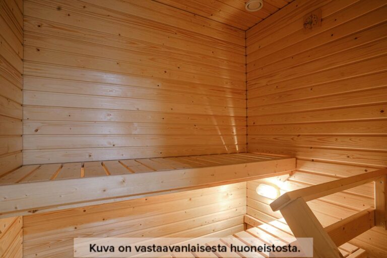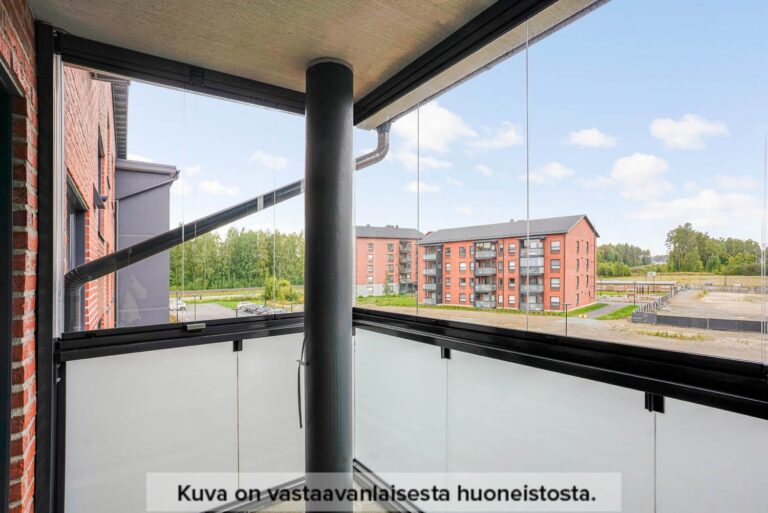 Toisen kerroksen tilava, saunallinen kaksio, jossa olohuone ja keittiö ovat avointa yhtenäistä tilaa. Makuuhuoneen yhteydessä oleva tila muuntautuu vaikka työ- tai pukeutumistilaksi. Säilytystilana on vaatehuone. Lasitettu parveke.