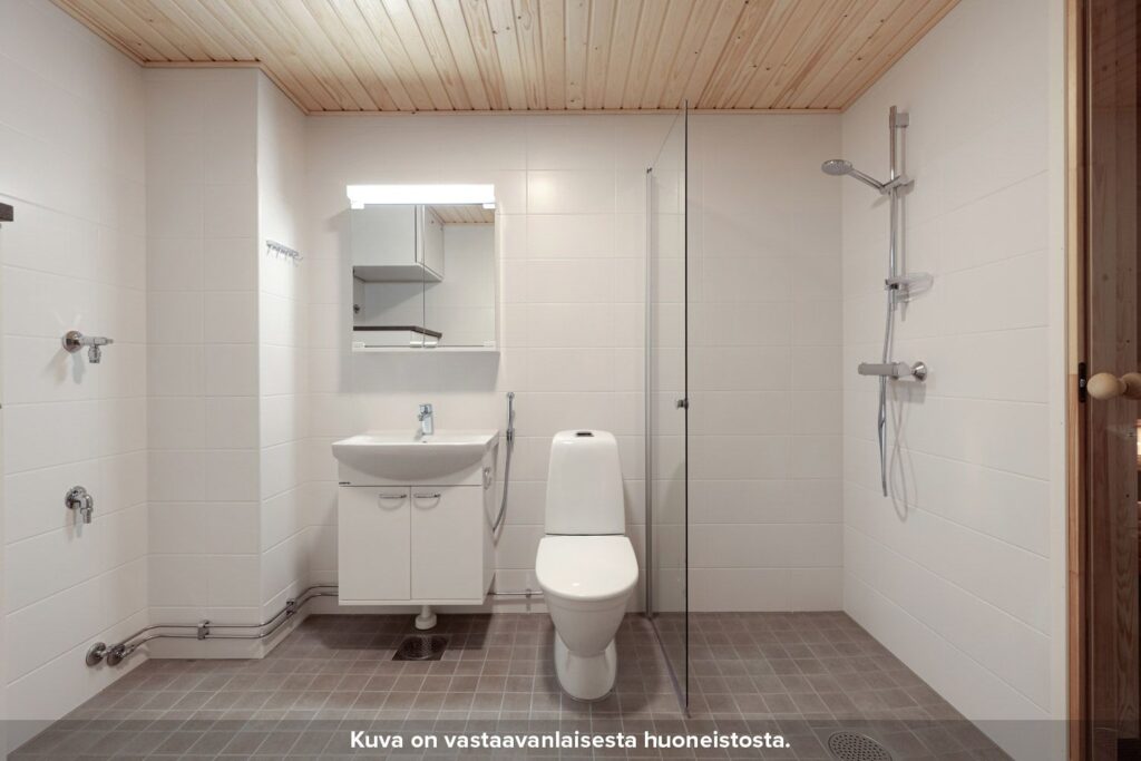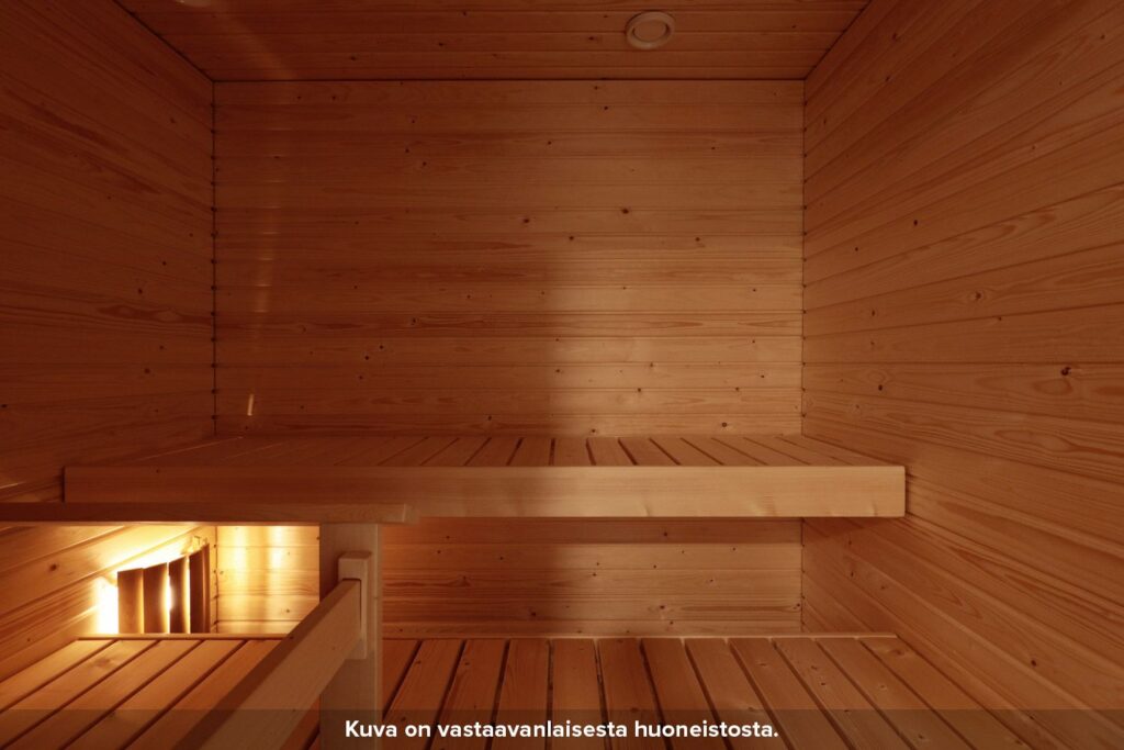 Laatoitetussa pesuhuoneessa on tilaa pyykinpesukoneelle ja kuivausrummulle, myös pyykkikaappi löytyy. Asuntoon kuuluu myös oma sauna. Asuinhuoneiden lattiat ovat laminaattia, asunnon pinnat ovat modernit.