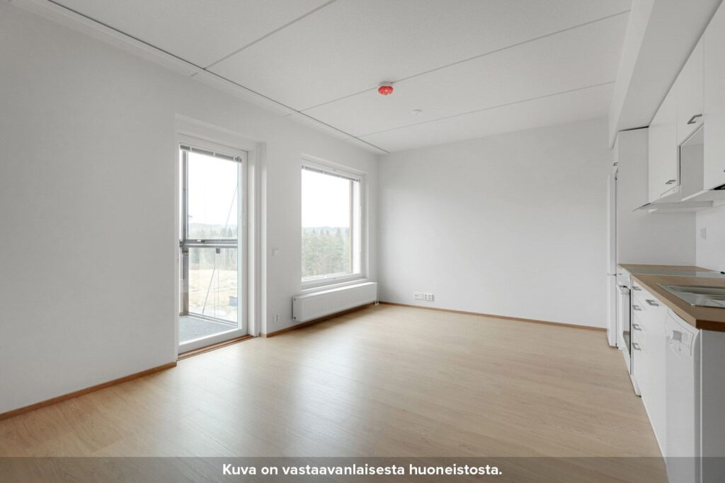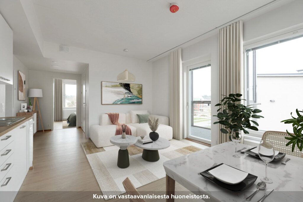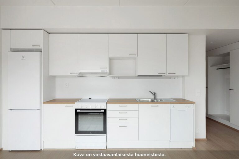 Keittiö on kätevästi sijoitettu olohuoneen yhteyteen, luoden toimivan tilan arjen askareille. Keittiöstä löytyy valmiina astianpesukone, keraaminen liesi ja jääkaappipakastin. Olohuoneesta pääsee tilavaan, kaakkoon suuntautuvaan parvekkeeseen.