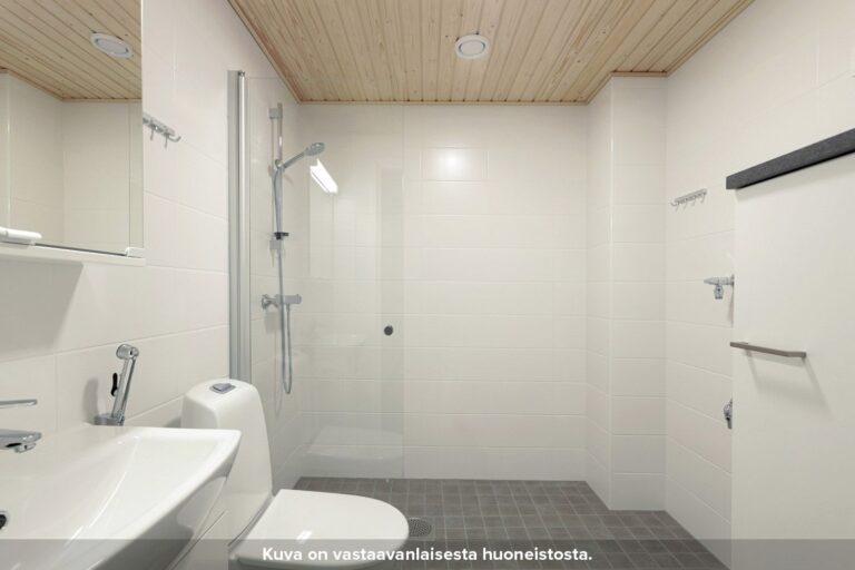 Laatoitetussa pesuhuoneessa on tilaa pyykinpesukoneelle ja kuivausrummulle, myös pyykkikaappi löytyy. Asuinhuoneiden lattiat ovat laminaattia, asunnon pinnat ovat modernit.