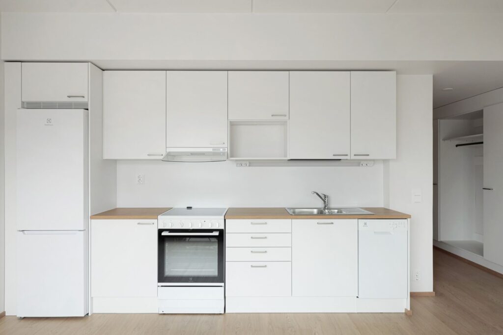Keittiö on kätevästi sijoitettu olohuoneen yhteyteen, luoden toimivan tilan arjen askareille. Keittiöstä löytyy valmiina astianpesukone, keraaminen liesi ja jääkaappipakastin. Olohuoneesta pääsee tilavaan, kaakkoon suuntautuvaan parvekkeeseen.