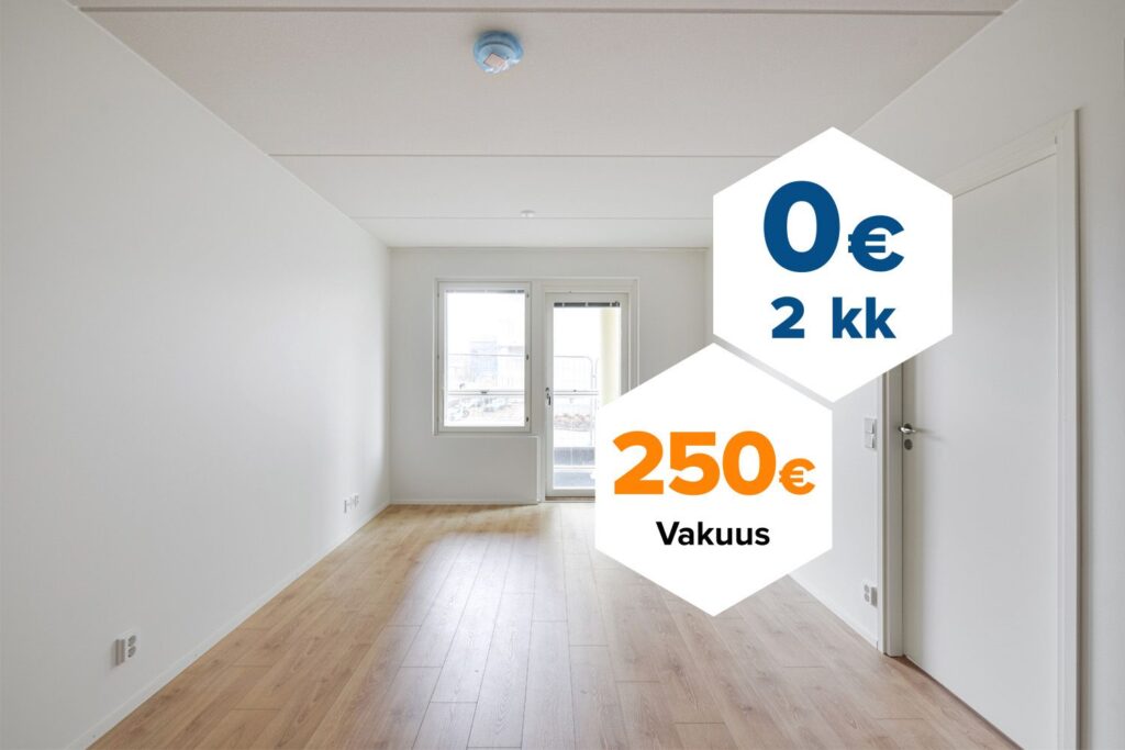 Tee sopimus nyt – saat kahden ensimmäisen kuukauden käyttövastikkeet hintaan 0 € ja vakuusmaksun 250 €. Etu voimassa 15.4.2026 saakka ja koskee vain uusia asiakkaita. Vesi- ja autopaikkamaksut normaalisti. Edellyttää 12 kk asumista.