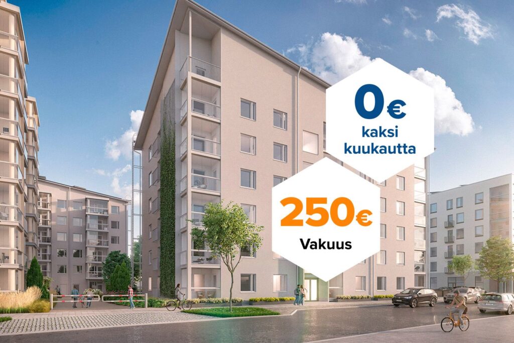 Tee sopimus nyt – saat kahden ensimmäisen kuukauden käyttövastikkeet hintaan 0 € ja vakuusmaksun 250 €. Etu voimassa 15.4.2026 saakka ja koskee vain uusia asiakkaita. Vesi- ja autopaikkamaksut normaalisti. Edellyttää 12 kk asumista.