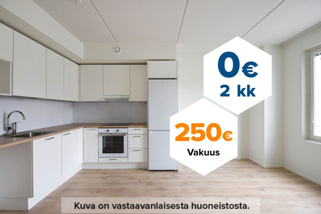 Tee sopimus nyt – saat kahden ensimmäisen kuukauden käyttövastikkeet hintaan 0 € ja vakuusmaksun 250 €. Etu voimassa 15.4.2026 saakka ja koskee vain uusia asiakkaita. Vesi- ja autopaikkamaksut normaalisti. Edellyttää 12 kk asumista.