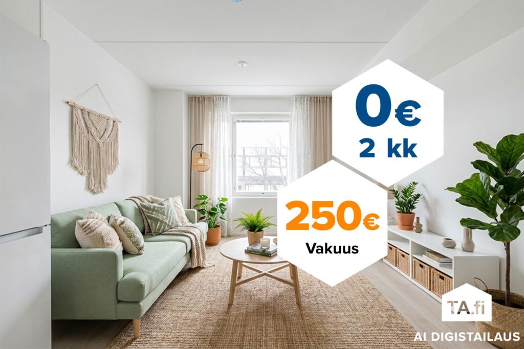 Tee sopimus nyt – saat kahden ensimmäisen kuukauden käyttövastikkeet hintaan 0 € ja vakuusmaksun 250 €. Etu voimassa 15.4.2026 saakka ja koskee vain uusia asiakkaita. Vesi- ja autopaikkamaksut normaalisti. Edellyttää 12 kk asumista.