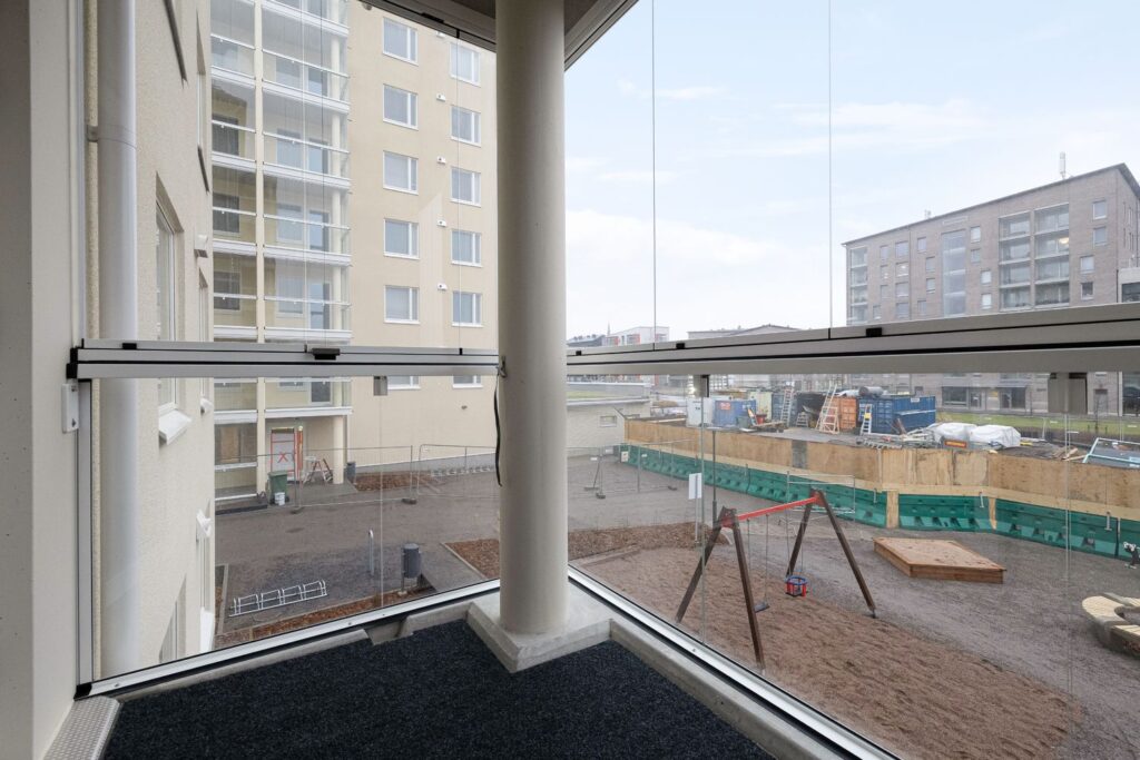 Moderni ja valoisa päätykolmio, joka tarjoaa erinomaisen pohjaratkaisun ja runsaasti luonnonvaloa. Olohuone ja keittiö muodostavat avaran yhtenäisen tilan, josta on käynti lasitetulle parvekkeelle. Keittiössä on laadukas Puustellin kalustus sekä modernit kodinkoneet: induktioliesi, jääkaappipakastin ja tilavaraus astianpesukoneelle ja mikrolle. Asunnossa on kaksi avaraa makuuhuonetta, moderni kylpyhuone sekä oma sauna kirkkailla lasiseinillä.