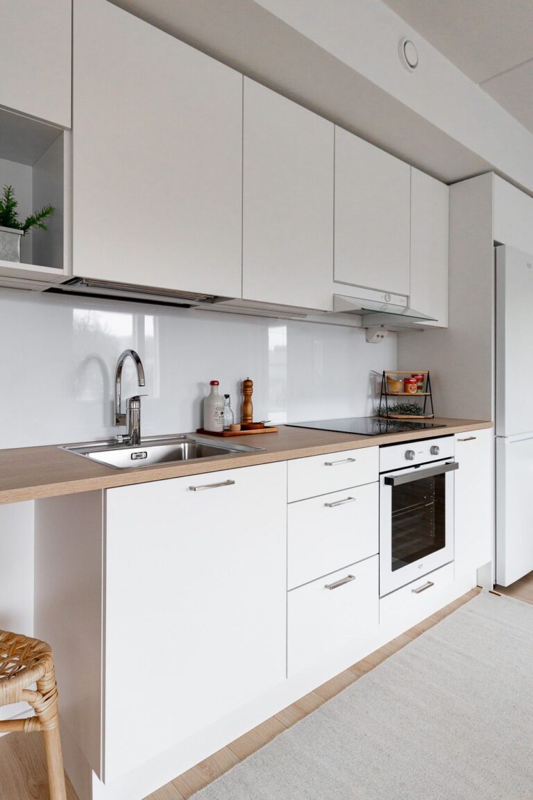 Moderni ja valoisa päätykolmio, joka tarjoaa erinomaisen pohjaratkaisun ja runsaasti luonnonvaloa. Olohuone ja keittiö muodostavat avaran yhtenäisen tilan, josta on käynti lasitetulle parvekkeelle. Keittiössä on laadukas Puustellin kalustus sekä modernit kodinkoneet: induktioliesi, jääkaappipakastin ja tilavaraus astianpesukoneelle ja mikrolle. Asunnossa on kaksi avaraa makuuhuonetta, moderni kylpyhuone sekä oma sauna kirkkailla lasiseinillä.