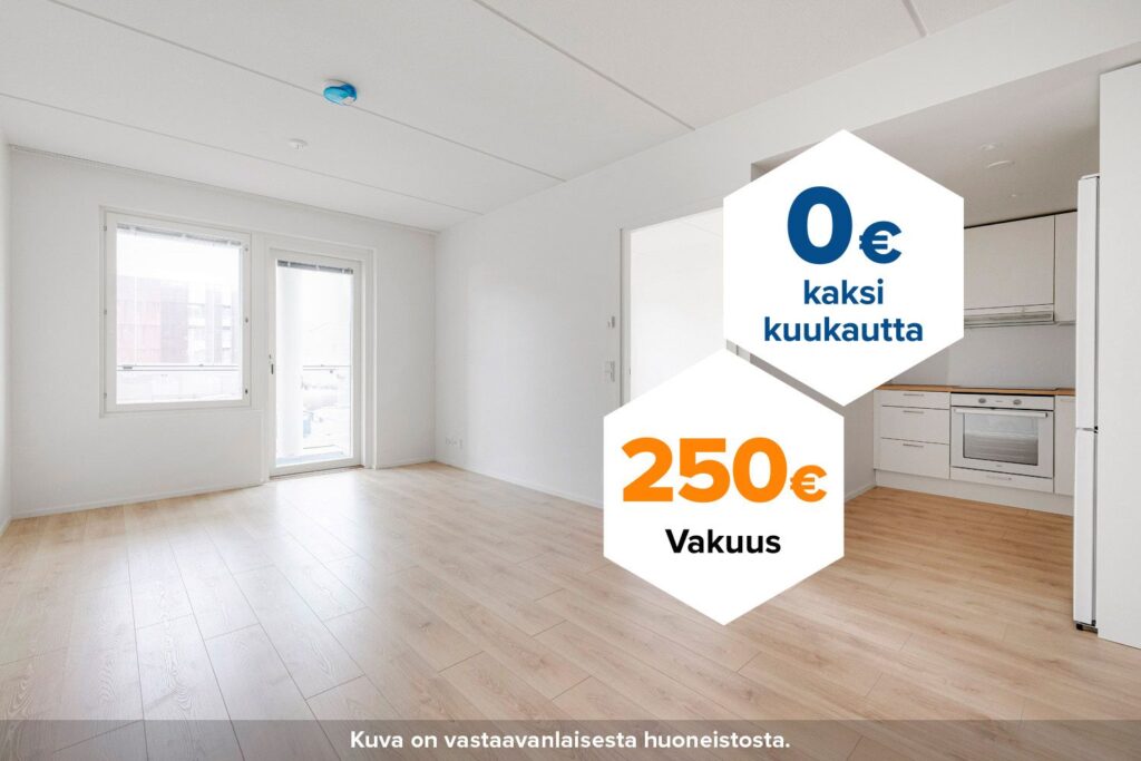 Tee sopimus nyt – saat kahden ensimmäisen kuukauden käyttövastikkeet hintaan 0 € ja vakuusmaksun 250 €. Etu voimassa 15.4.2026 saakka ja koskee vain uusia asiakkaita. Vesi- ja autopaikkamaksut normaalisti. Edellyttää 12 kk asumista.