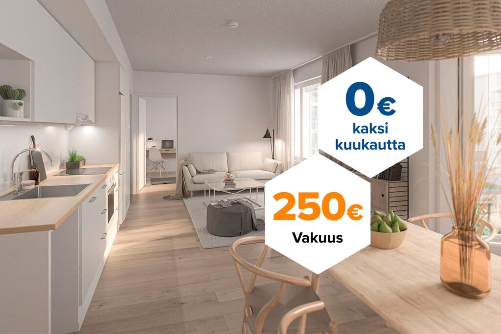 Tee sopimus nyt – saat kahden ensimmäisen kuukauden käyttövastikkeet hintaan 0 € ja vakuusmaksun 250 €. Etu voimassa 15.4.2026 saakka ja koskee vain uusia asiakkaita. Vesi- ja autopaikkamaksut normaalisti. Edellyttää 12 kk asumista.