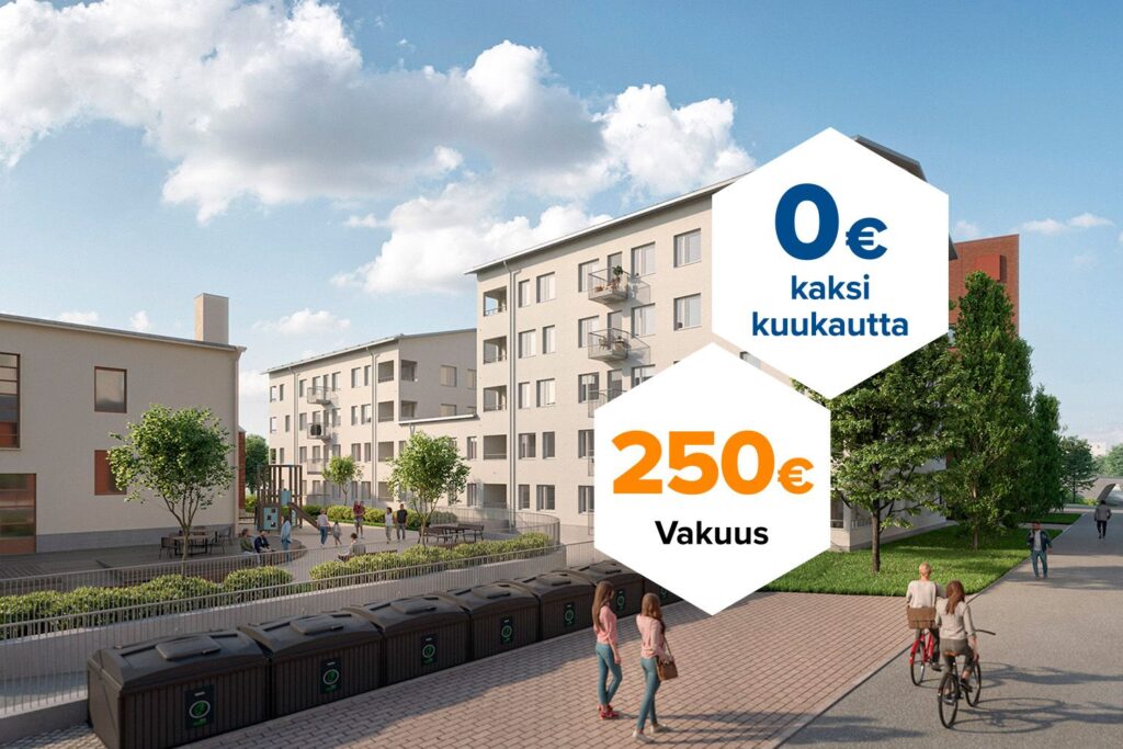 Tee sopimus nyt – saat kahden ensimmäisen kuukauden käyttövastikkeen hintaan 0 € ja vakuusmaksun 250 €. Edut ovat voimassa 15.4.2026 saakka ja koskevat vain uusia asiakkaita. Vesi- ja autopaikkamaksut normaalisti. Edellyttää 12 kuukauden asumista.