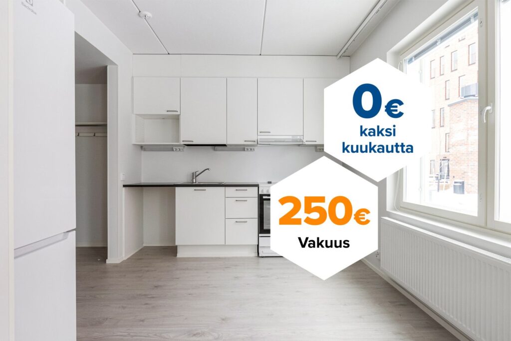 Tee sopimus nyt – saat kahden ensimmäisen kuukauden käyttövastikkeen hintaan 0 € ja vakuusmaksun 250 €. Edut ovat voimassa 15.4.2026 saakka ja koskevat vain uusia asiakkaita. Vesi- ja autopaikkamaksut normaalisti. Edellyttää 12 kuukauden asumista.