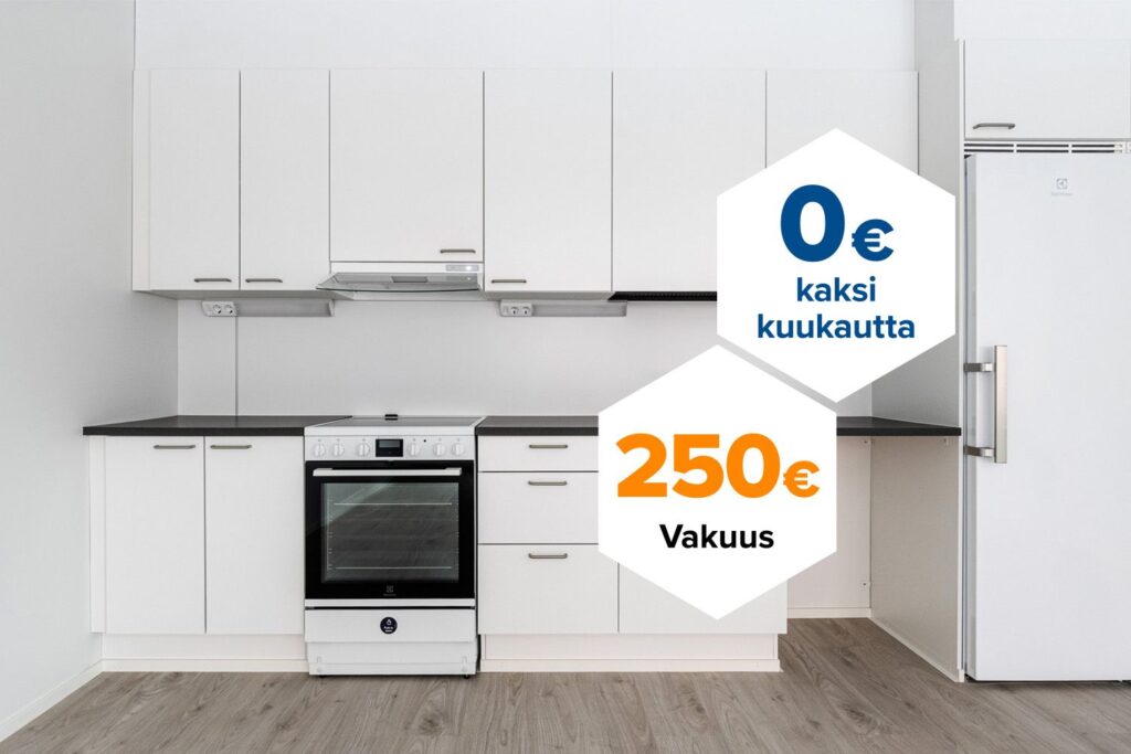 Tee sopimus nyt – saat kahden ensimmäisen kuukauden käyttövastikkeen hintaan 0 € ja vakuusmaksun 250 €. Edut ovat voimassa 15.4.2026 saakka ja koskevat vain uusia asiakkaita. Vesi- ja autopaikkamaksut normaalisti. Edellyttää 12 kuukauden asumista.