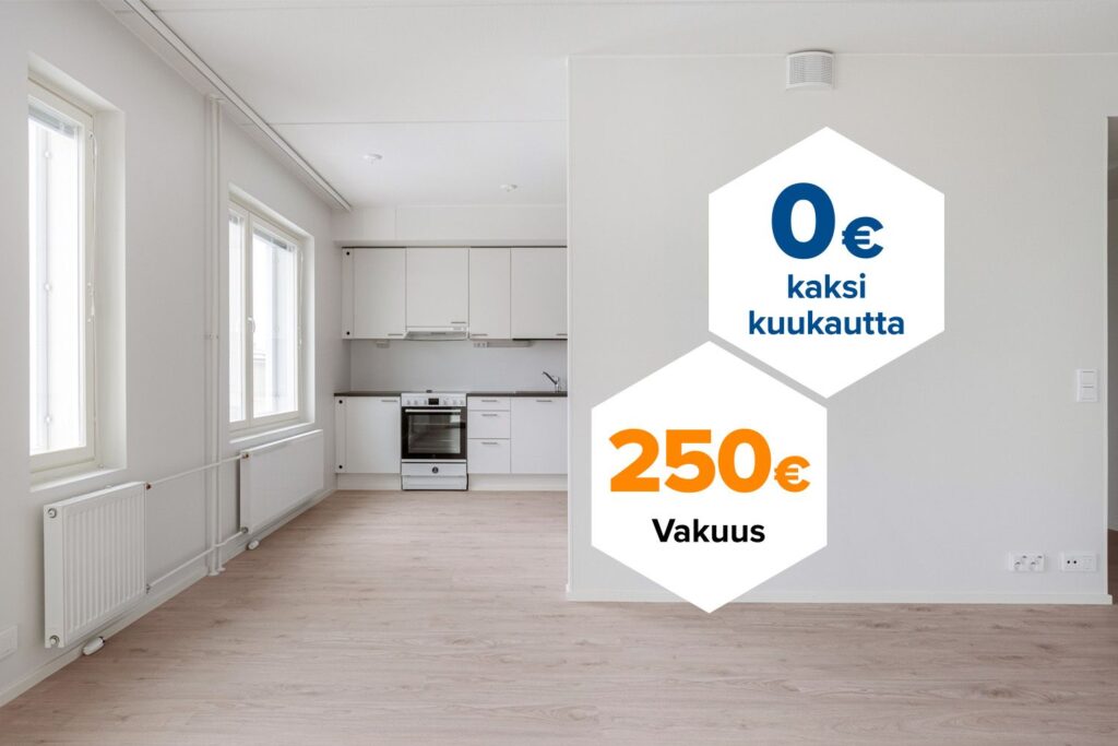 Tee sopimus nyt – saat kahden ensimmäisen kuukauden käyttövastikkeen hintaan 0 € ja vakuusmaksun 250 €. Edut ovat voimassa 15.4.2026 saakka ja koskevat vain uusia asiakkaita. Vesi- ja autopaikkamaksut normaalisti. Edellyttää 12 kuukauden asumista.