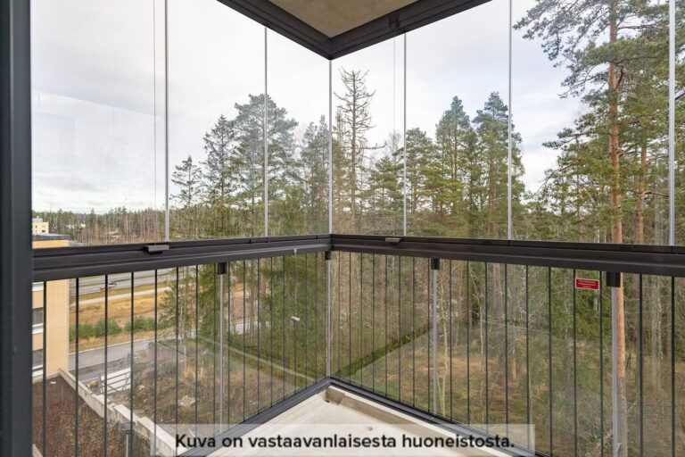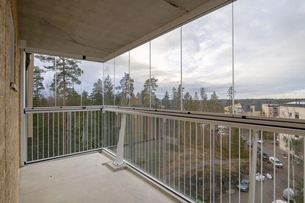 Avoin keittiö-olohuonetila jatkuu lasitetulle parvekkeelle – täydellinen paikka aamukahville tai iltahetkelle. Keittiössä on induktioliesi, astianpesukone ja jääkaappipakastin.
