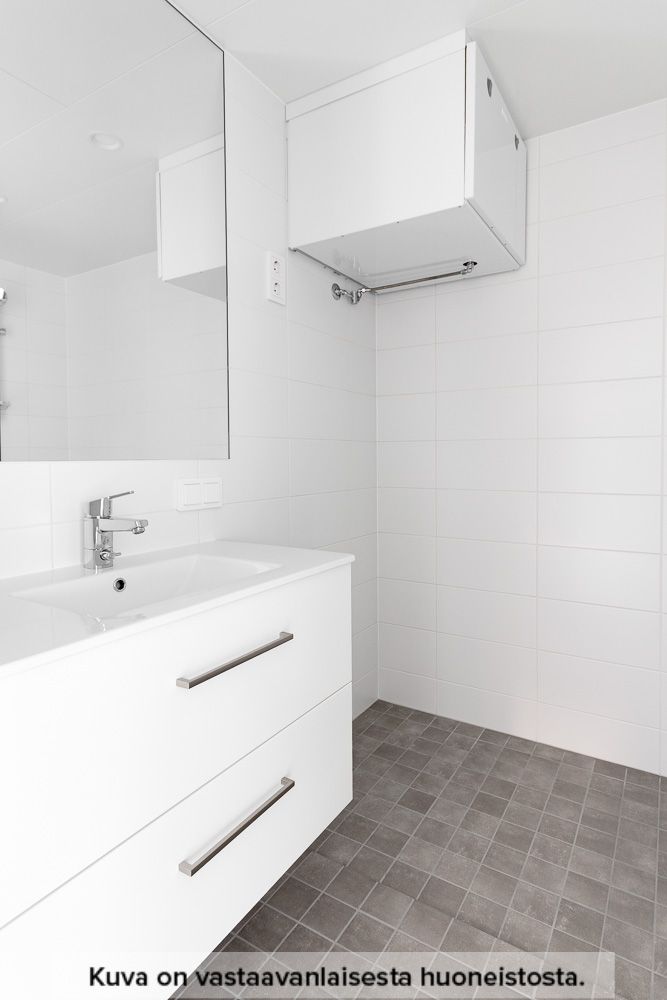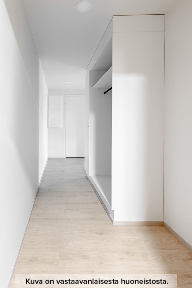 Laatoitetussa kylpyhuoneessa on tilavaraus pesutornille. Muualla asunnossa on laminaattilattiat sekä sälekaihtimet. Säilytystilaa löytyy makuuhuoneen ja eteisen kaapistoista, ja lasitettu parveke tuo lisätilaa ympäri vuoden.