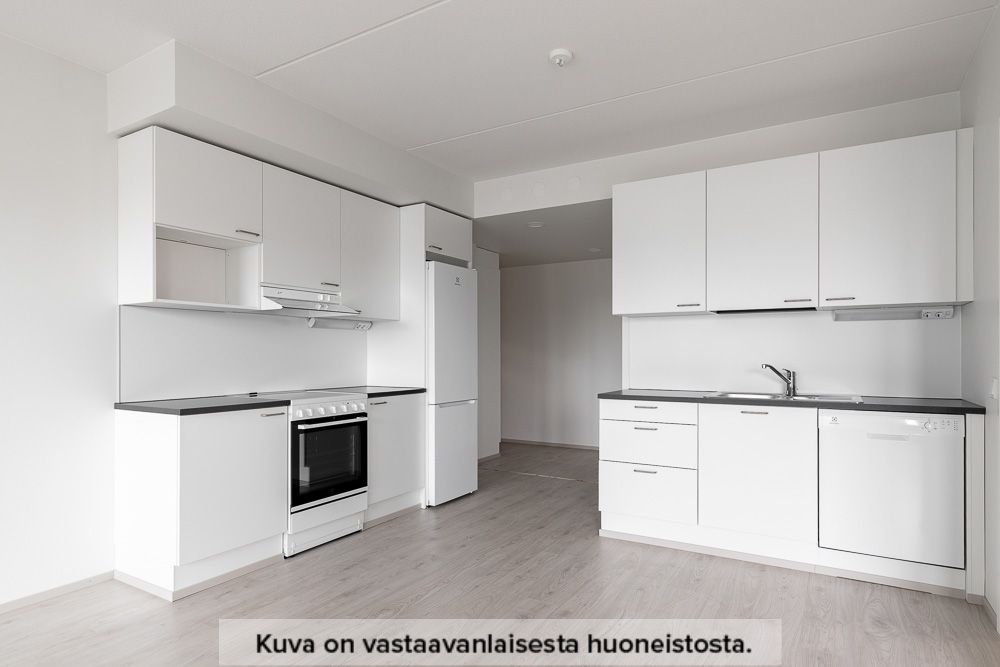 UUDISKOHDE. Tämä neljännen kerroksen iso kaksio on viihtyisä kulma-asunto, jossa on erinomaiset puitteet mukavaan arkeen. Isossa olohuoneessa on tilaa niin oleskeluun kuin ruokailuun ja tarvittaessa vaikka työpisteellekin. Keittiön varusteluun kuuluu keraaminen liesi, astianpesukone ja jääkaappipakastin.