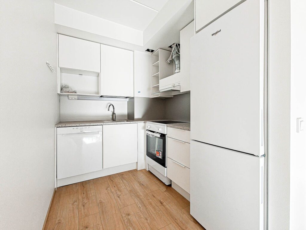 Avoin keittiö-olohuone jatkuu lasitetulle parvekkeelle, joka tuo asuntoon lisätilaa ja valoa. Keittiössä on induktioliesi, astianpesukone sekä jääkaappi-pakastin. Säilytystilaa löytyy eteisestä sekä makuuhuoneen yhteydessä sijaitsevasta vaatehuoneesta.