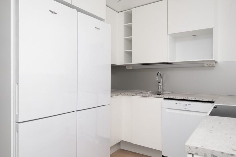 Asunnossa on tilavat makuuhuoneet, jotka sijoittuvat omiin nurkkiinsa. Kaappitilaa löytyy eteisestä sekä makuuhuoneista. Keittiössä on induktioliesi, astianpesukone sekä kaksi jääkaappi-pakastinta.