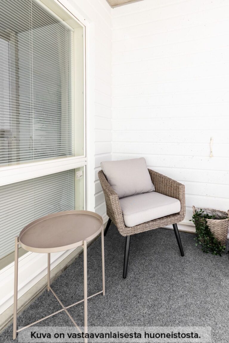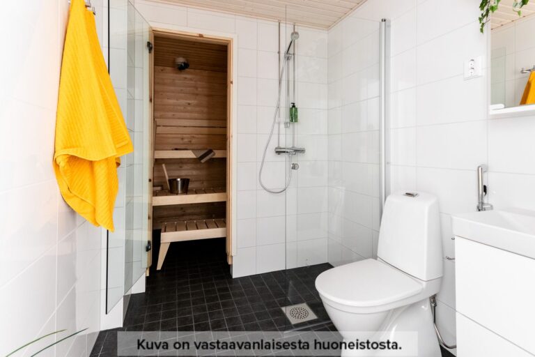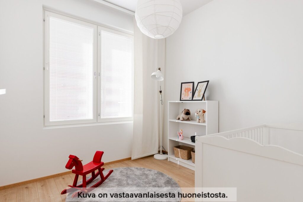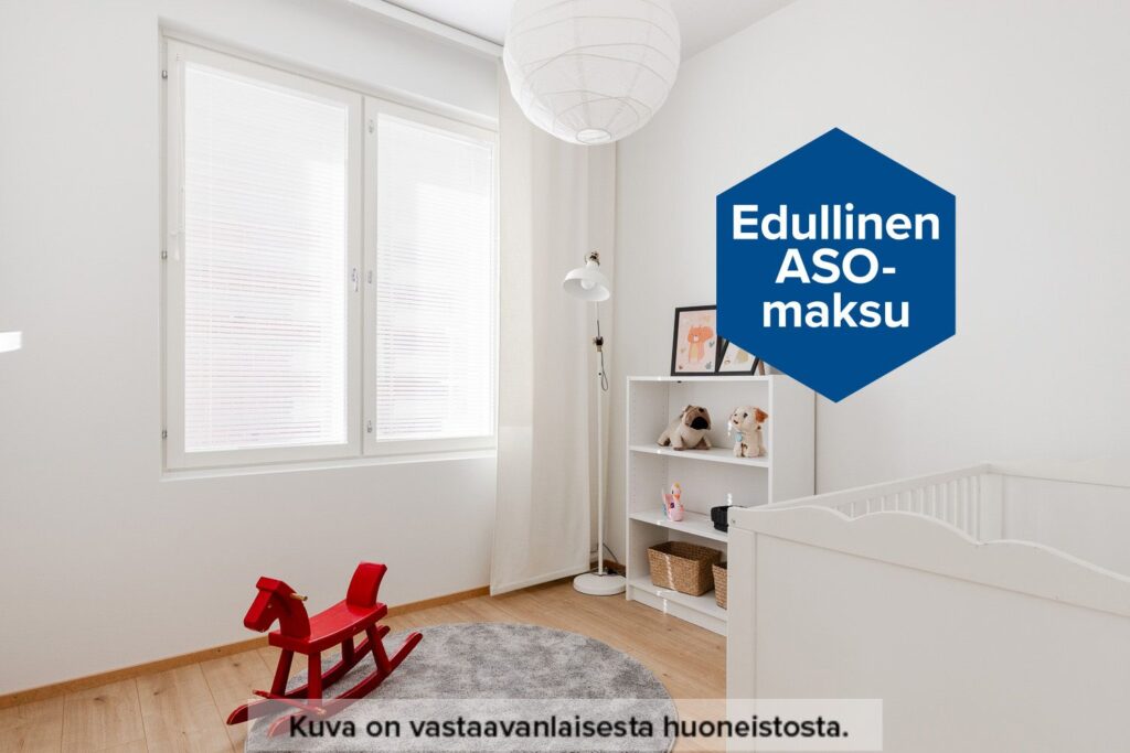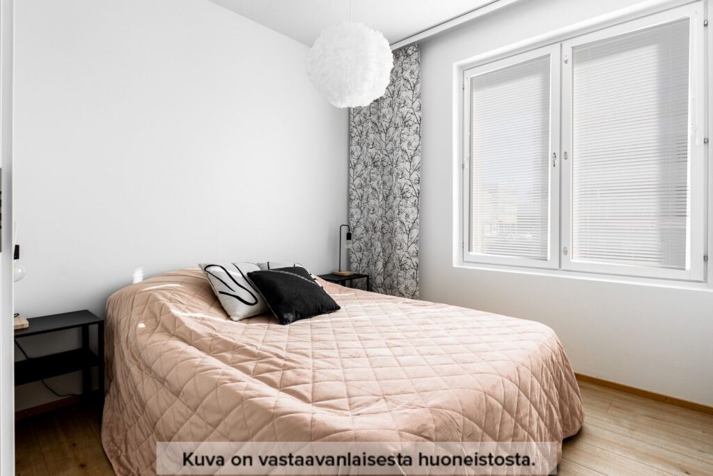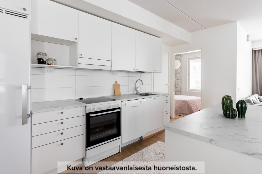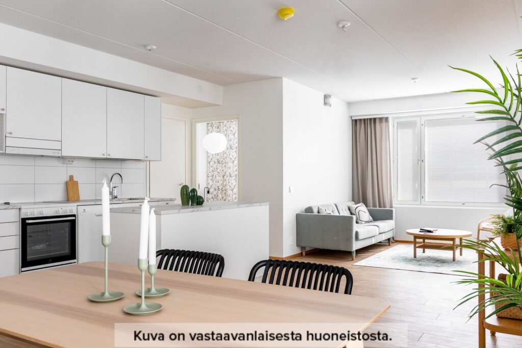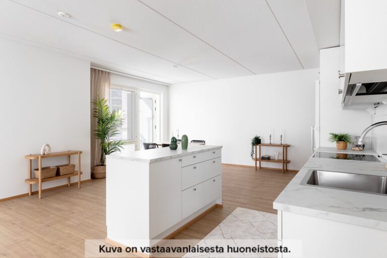 Tämä kolmannen kerroksen neljän huoneen asunto tarjoaa tilaa ja avaruutta isommankin perheen tarpeisiin. Olohuone ja keittiö muodostavat yhdessä avoimen tilan, jossa on viihtyisät puitteet kokkailulle, ruokailulle ja oleskelulle. Keittiötilassa on saareke, joka tarjoaa mukavasti laskutilaa. Lisäksi valmiina on astianpesukone, keraaminen liesi sekä erilliset jääkaappi ja pakastin. Olohuoneesta pääsee lasitetulle parvekkeelle. Asunto sijaitsee talon kulmassa, joten ikkunoita on kahteen ilmansuuntaan. Makuuhuoneita on kolme, ja niissä on mukavasti kaappitilaa. Arkea helpottaa erillinen wc sekä laatoitettu kylpyhuone, jossa on liitännät pyykinpesukoneelle ja kuivausrummulle. Tyylikäs laminaattilattia tuo yhtenäistä ilmettä asuntoon, ja sälekaihtimet ikkunoissa lisäävät asumismukavuutta.