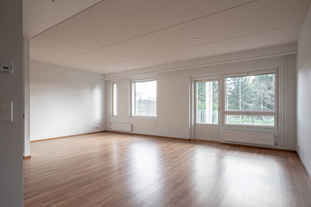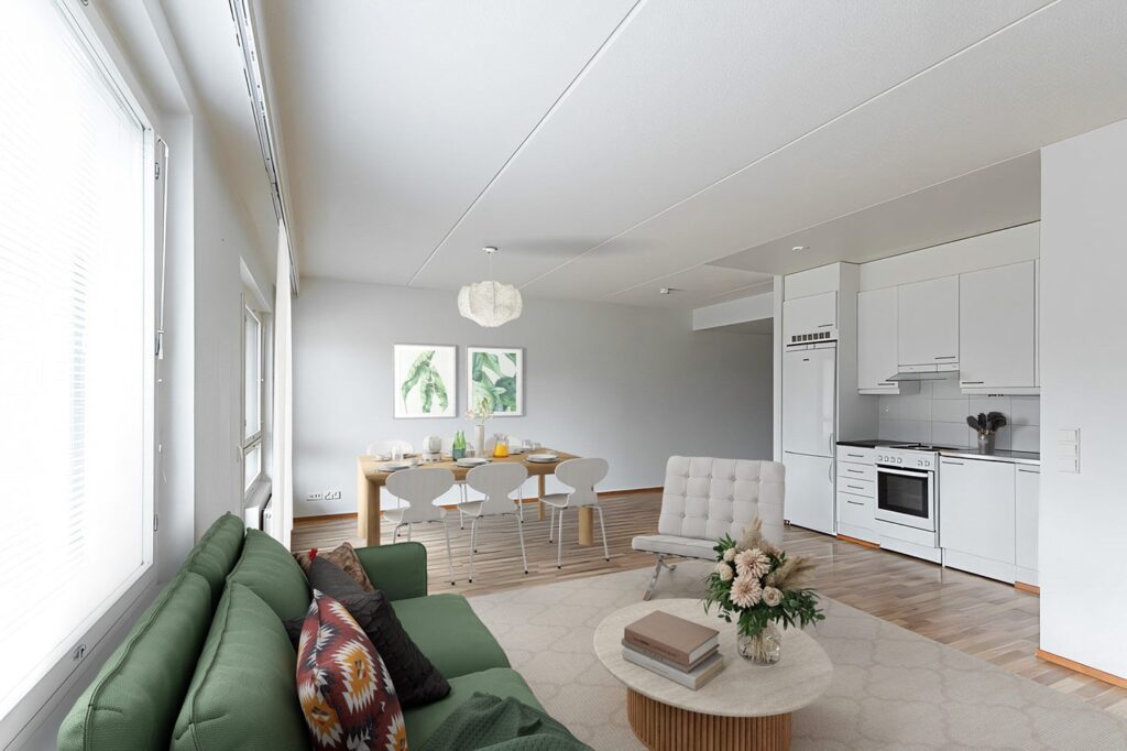 Tämä valoisa ja avara pohjakerroksen kaksio hurmaa käytännöllisellä pohjaratkaisullaan ja modernilla ilmeellään. Kodin sydän on tilava olohuone, joka yhdistyy sulavasti keittiöön ja ruokailutilaan, tarjoten paljon tilaa arkeen ja yhdessäoloon. Suuret ikkunat tuovat runsaasti luonnonvaloa, ja asunnon parveke tarjoaa mukavan ulkotilan esimerkiksi aamukahvihetkiin.