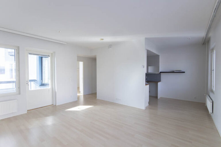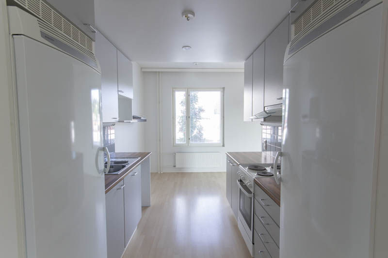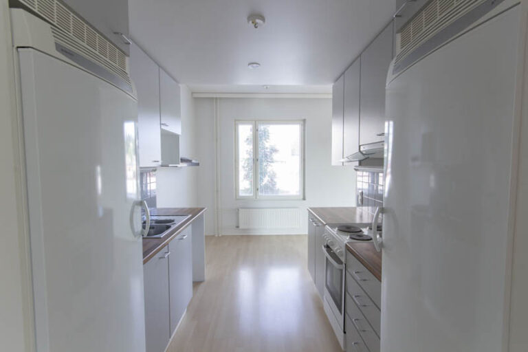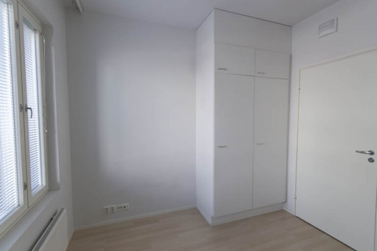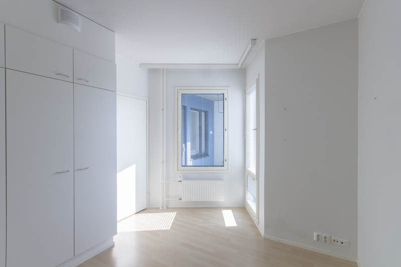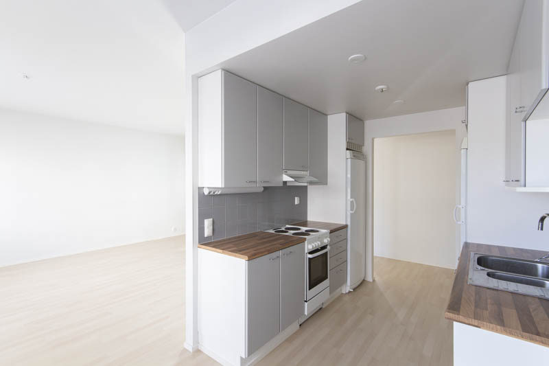 Pohjaratkaisu on selkeä ja toimiva: kaksi reilunkokoista makuuhuonetta tarjoavat hyvin tilaa niin lepoon kuin työskentelyyn. Olohuone ja keittiö muodostavat yhtenäisen, avaran oleskelutilan, jossa on helppo viettää aikaa ja kattaa pöytä niin arkeen kuin viikonloppuun. Keittiössä on runsaasti säilytys- ja työskentelytilaa, mikä tekee ruoanlaitosta käytännöllistä.