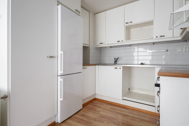 Kolmannen kerroksen avarapohjainen läpitalon kolmio, johon tulee valoa kahdesta ilmansuunnasta. Ikkunallisessa keittiössä on mukavasti tilaa ja oma rauha kokkailla. Keittiössä on keraaminen liesi, jääkaappipakastin sekä tilavaraukset astianpesukoneelle ja mikrolle.