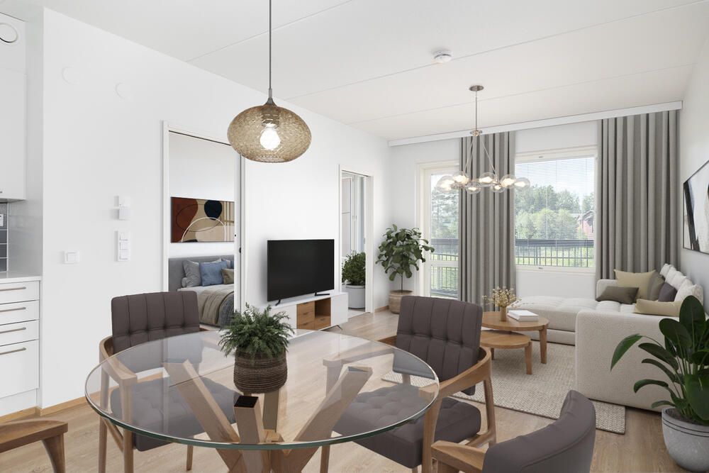 Valoisa ja avara toisen kerroksen kaksio tarjoaa modernia asumismukavuutta erinomaisella pohjaratkaisulla. Asunnossa on tilava olohuone, joka yhdistyy saumattomasti ruokailutilaan ja keittiöön, luoden avointa tunnelmaa. Suuret ikkunat tuovat runsaasti luonnonvaloa sisään, ja lasitettu parveke tarjoaa viihtyisän paikan nauttia aamukahvista tai iltahetkistä. Oma sauna tarjoaa mahdollisuuden rentoutua kotona juuri silloin, kun haluat. Tämä koti on täydellinen valinta, jos arvostat toimivuutta, tyylikkyyttä ja pientä arjen luksusta! Kuvat ovat vastaavasta asunnosta.