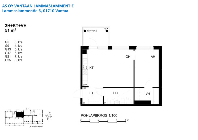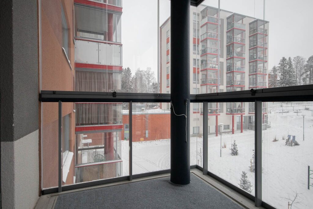 Tilava kolmannen kerroksen kaksio lasitetulla parvekkeella. Erillinen eteinen jakaa tilaa mukavasti. Avara pesuhuone pyykinpesukoneliitännällä. Makuuhuoneessa sijaitseva vaatehuone tuo valtavasti lisää säilytystilaa. Parveke toimii kesäisin kuin ylimääräisenä huoneena. Lasituksensa ansiosta viihdyt parvekkeella säällä kuin säällä.