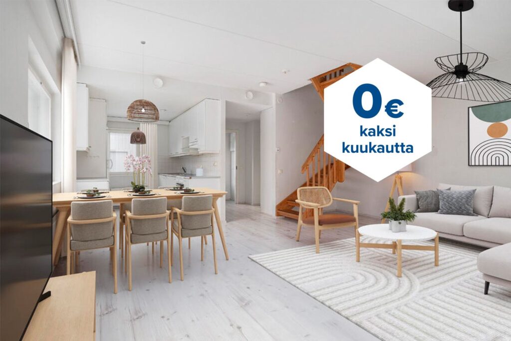 Tee sopimus nyt – saat ensimmäisen kuukauden käyttövastikkeen hintaan 0 €. Etu on voimassa 15.4.2026 saakka ja koskee vain vapaita asuntoja ja uusia asiakkaita. Vesi- ja autopaikkamaksut normaalisti.