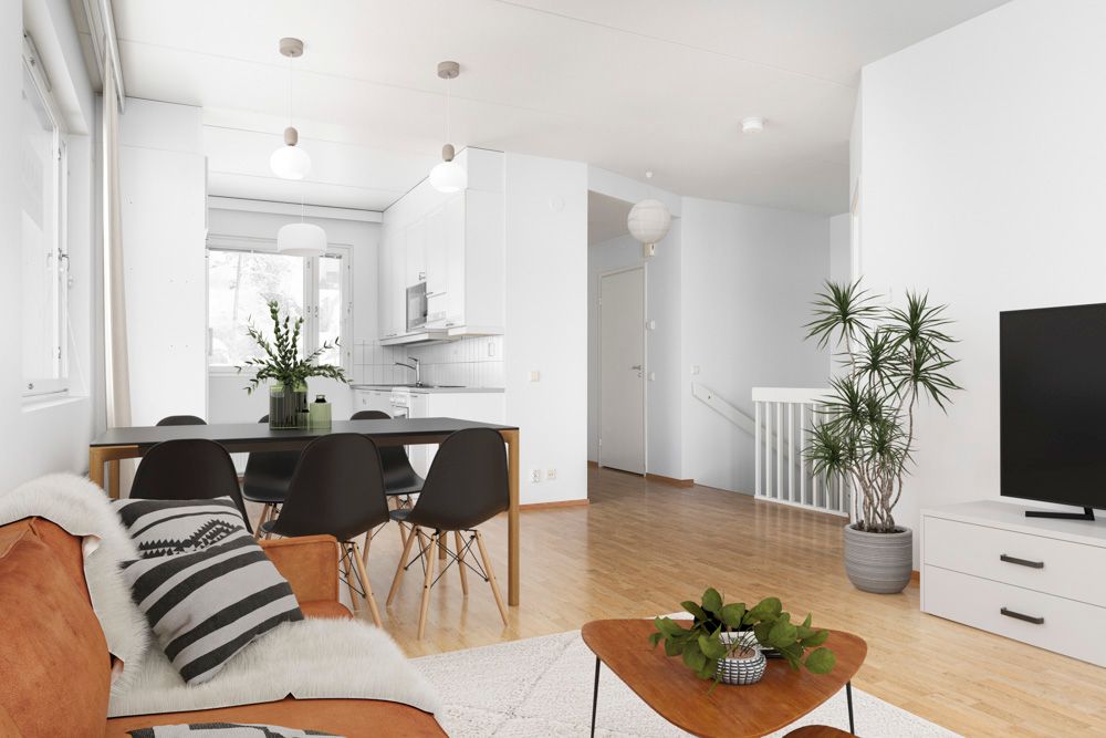 Tilava neljän huoneen asunto E-talon päätyhuoneistosta, joka sijaitsee rinnetontilla. Asunnon sisäänkäyntikerroksessa keittiö, jossa vaaleat pinnat ja hyvin säilytystilaa, olohuone, yksi makuuhuone sekä erillis-wc. Alakerrasta löytyy valoisa olohuone, jonka yhteydessä vaatehuone, toinen makuuhuone sekä kylpyhuone, jonka yhteydessä sauna. Huoneistokohtainen kylmä irtainvarasto on aivan sisäänkäynnin vieressä. Kokonaisuuden viimeistelee terassi ja oma piha.