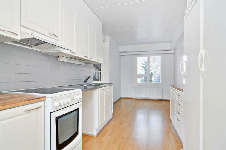 Keittiö on suunniteltu toimivaksi ja tarjoaa kaappi- ja työtilaa arjen ruoanlaittoon. Sen yhteys olohuoneeseen tekee tilasta sosiaalisen, ja perheen yhdessäolo on helppoa myös kokkaillessa.